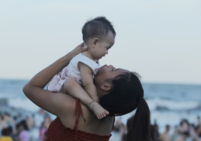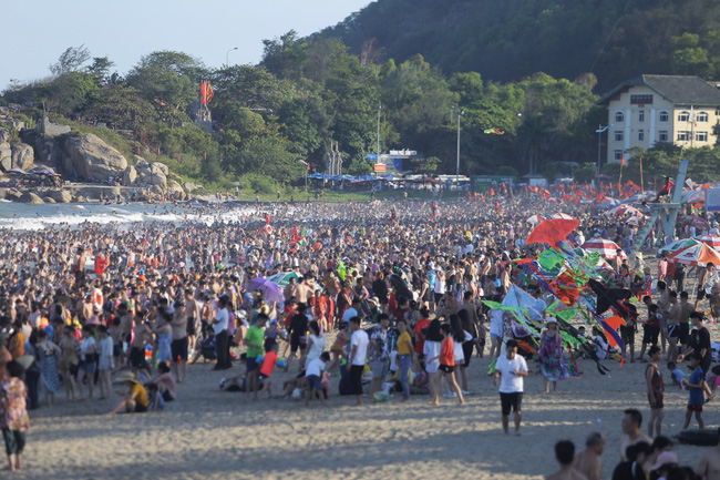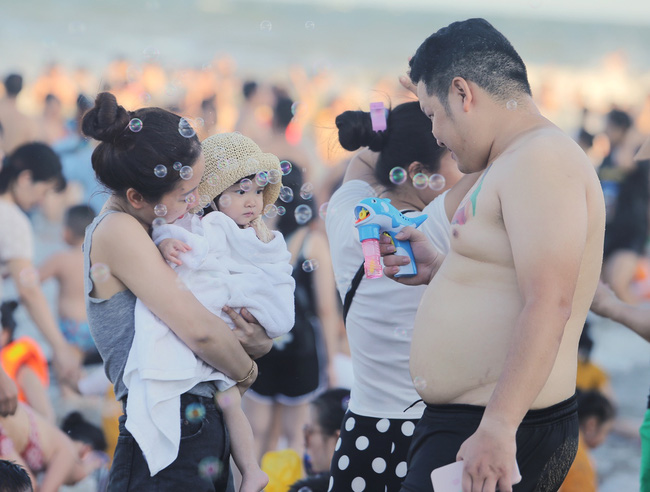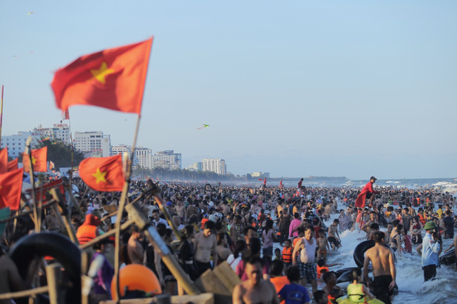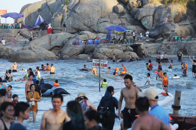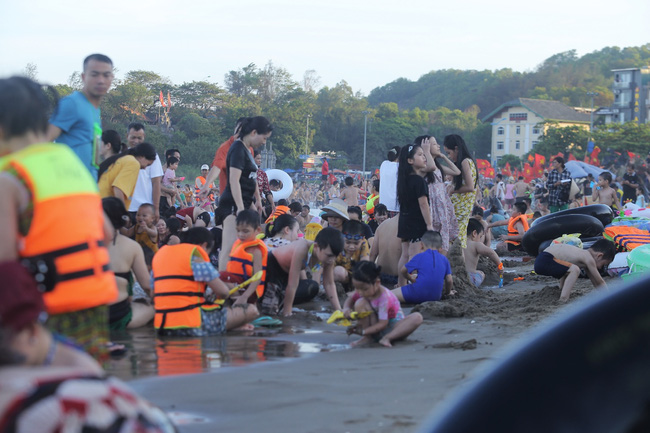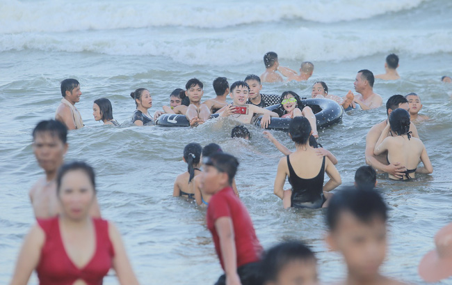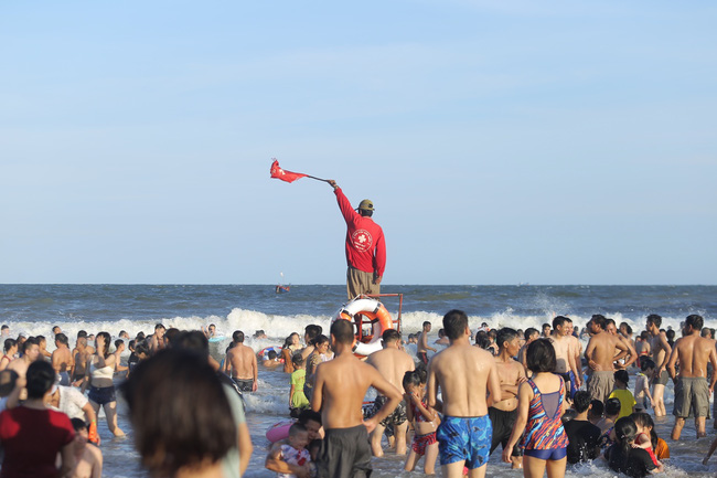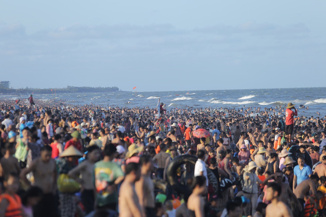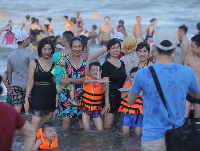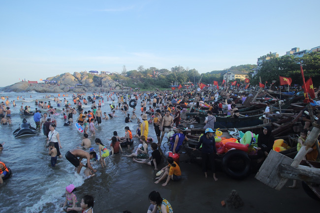 Ghi nhận chiều 25/7, mặc dù thời tiết khá oi bức tuy nhiên hàng vạn du khách từ khắp nơi đồ về tạo nên biển người nêm chặt biển Sầm Sơn. Dọc bãi biển từ đền Độc Cước kéo dài tới bãi tắm D, biển người chen chúc nhau cả trên bãi cát lẫn dưới nước.