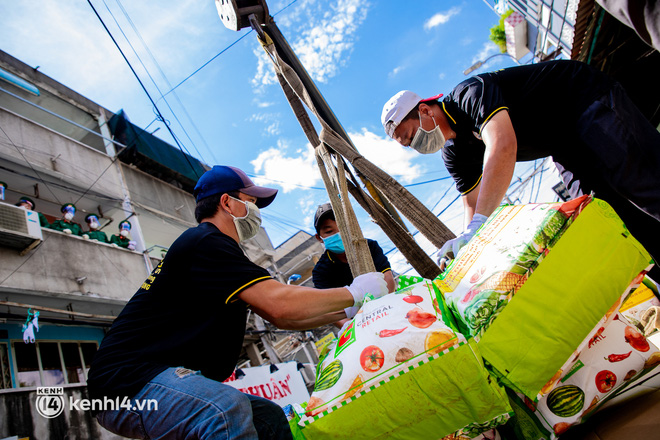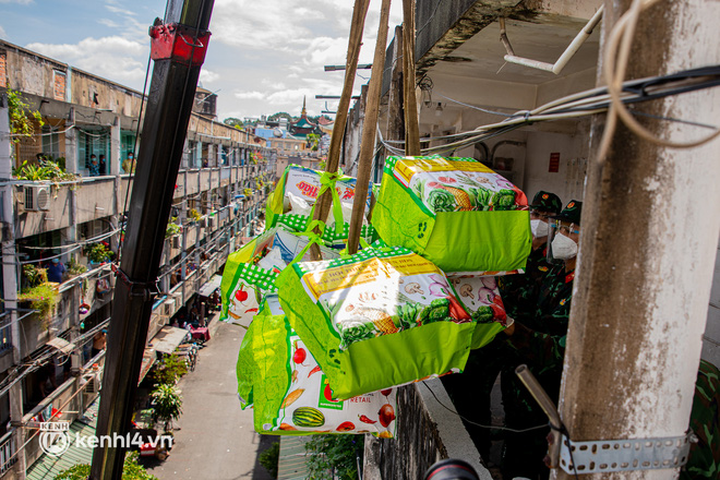 Chung cư này có 4 tầng nên việc sử dụng cần cẩu để móc quà đưa lên sẽ giúp cho các tình nguyện viên của nhóm BDS cũng như hàng chục chiến sĩ bộ đội tiết kiệm được công sức và việc trao quà diễn ra nhanh chóng hơn, người dân không cần phải chờ xếp hàng, chỉ cần ngồi yên trong nhà - quà sẽ tới tận tay.