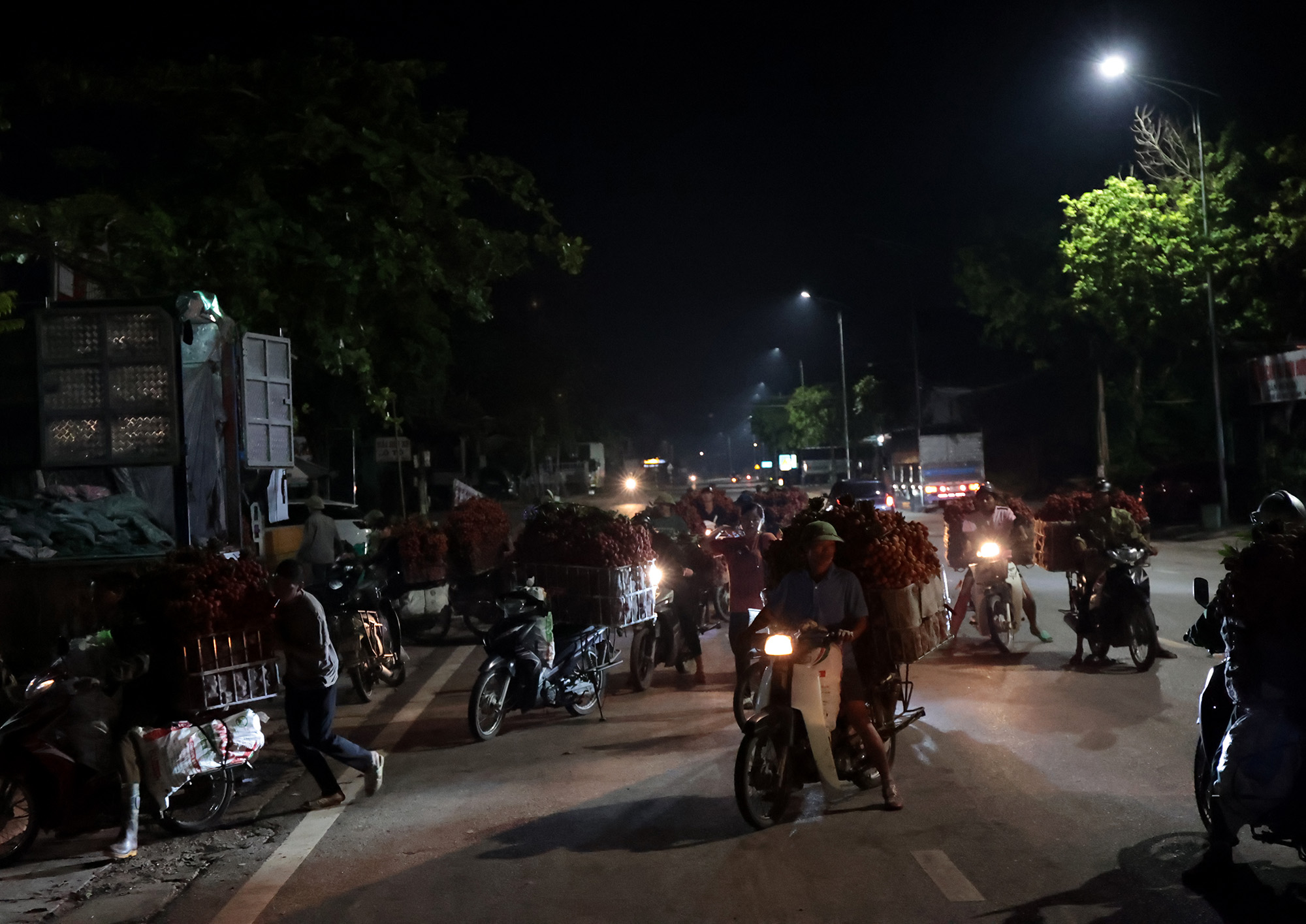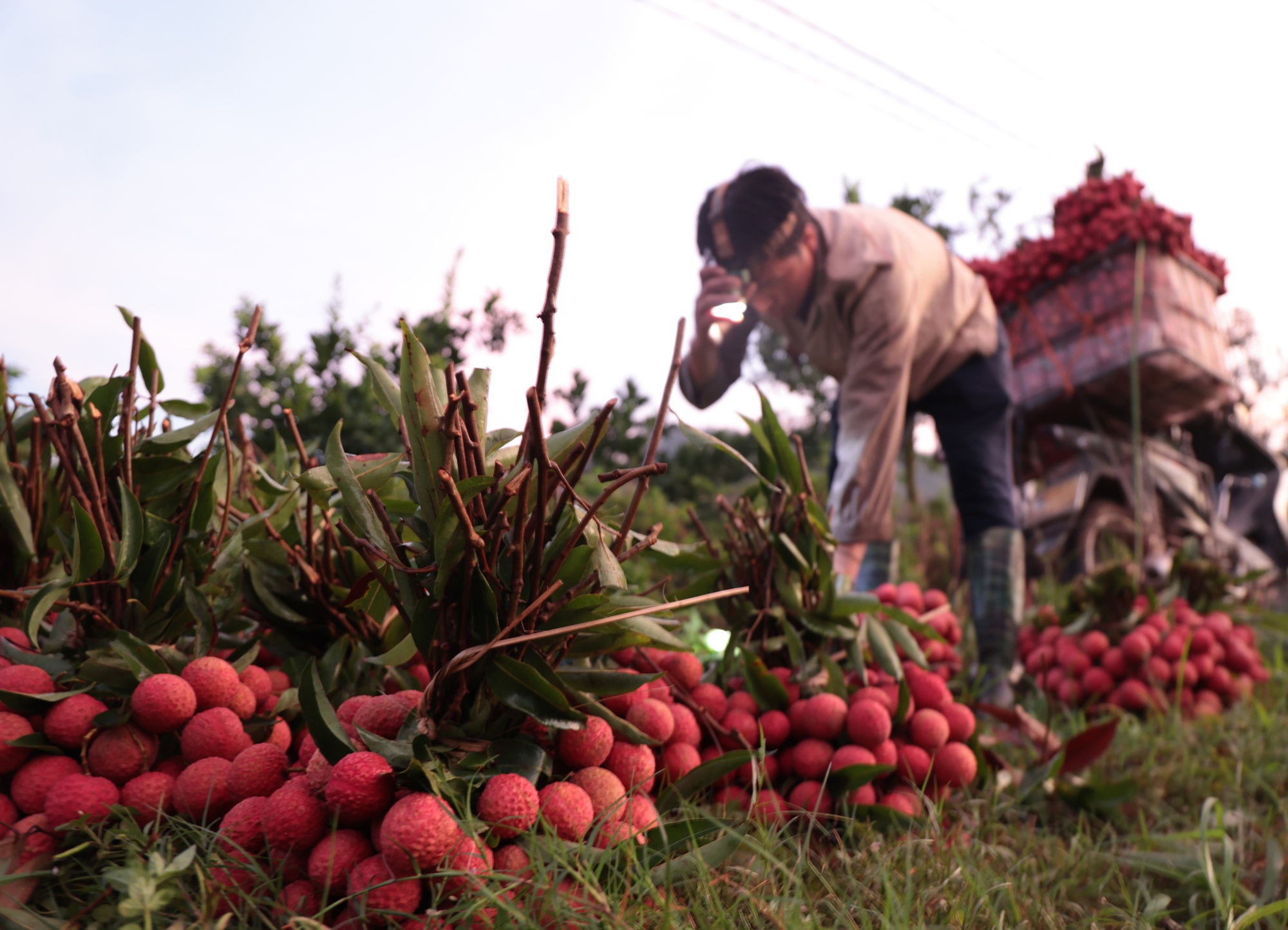 Những ngày cuối tháng 6, vải thiều ở huyện Lục Ngạn (tỉnh Bắc Giang) bước vào thời điểm chính vụ, hàng trăm hec-ta vải đang chờ đợi người dân thu hoạch. Năm nay vải được mùa, để thu hoạch kịp thời đem bán cho các thương lái vào sáng sớm với giá cao, nhiều hộ dân phải dậy từ 2-3 giờ sáng để vặt vải, xếp gọn lên xe rồi chở lên các điểm cân hoặc điểm thu mua.