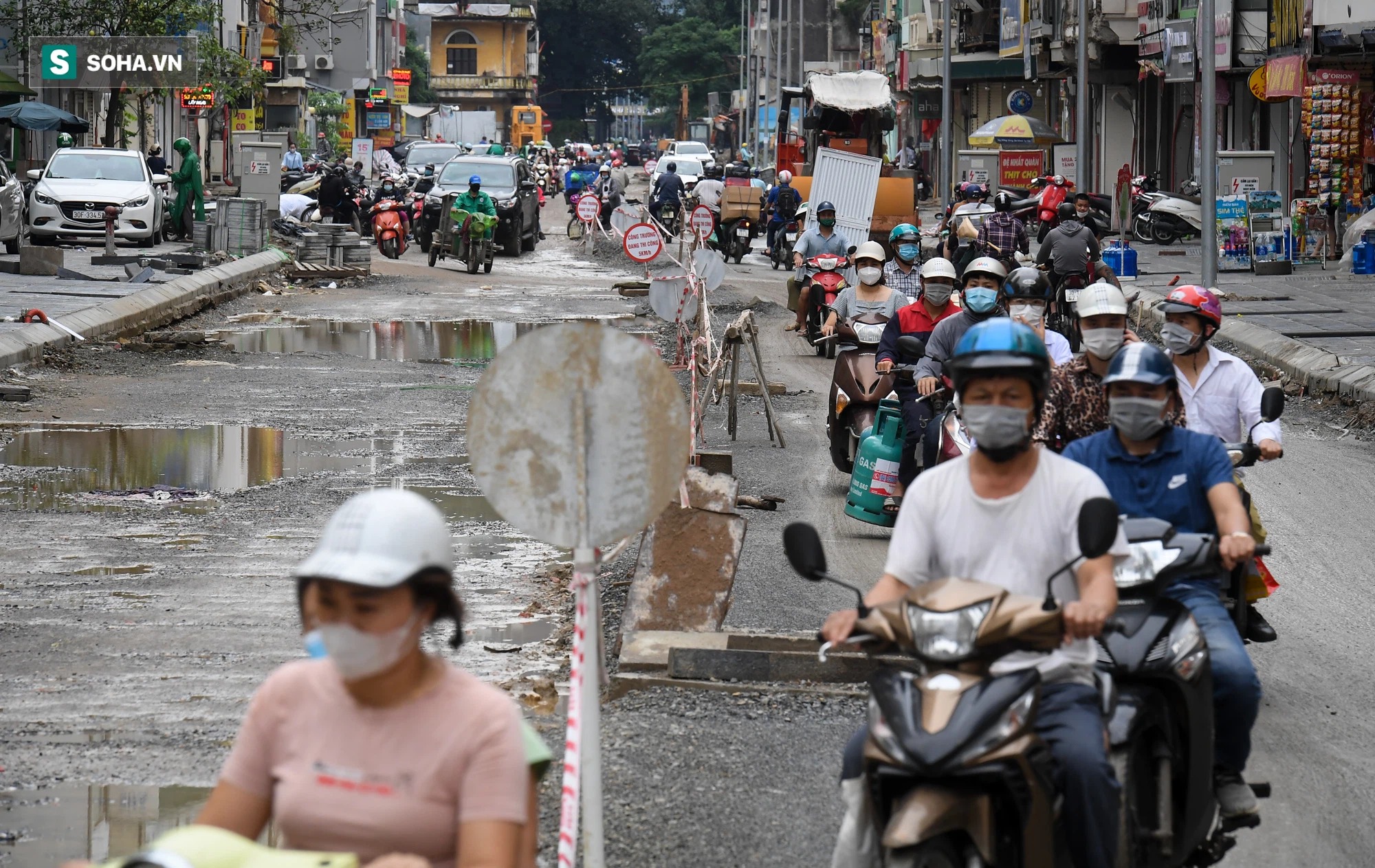 Đường Vũ Trọng Phụng mới thi công xong phần ngầm và trải nhựa một bên. Một nửa còn lại vẫn đầy hố. Khi trời mưa, đường trở nên lầy lội, trơn trượt.