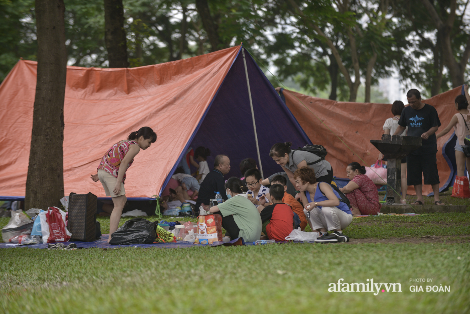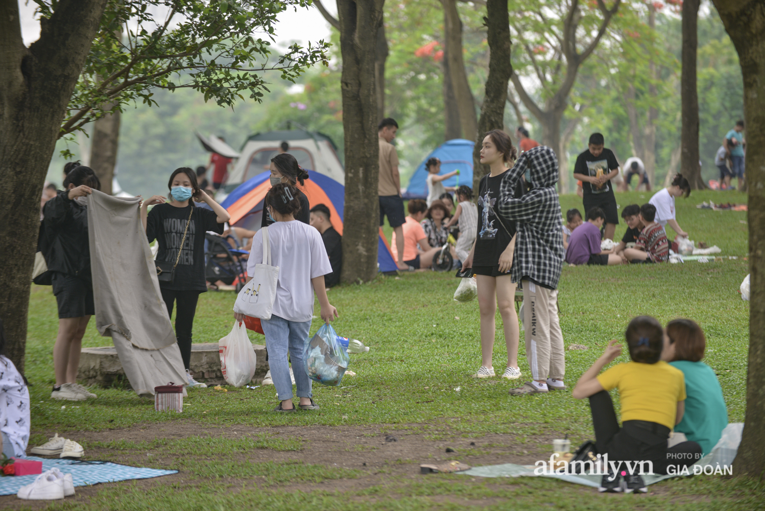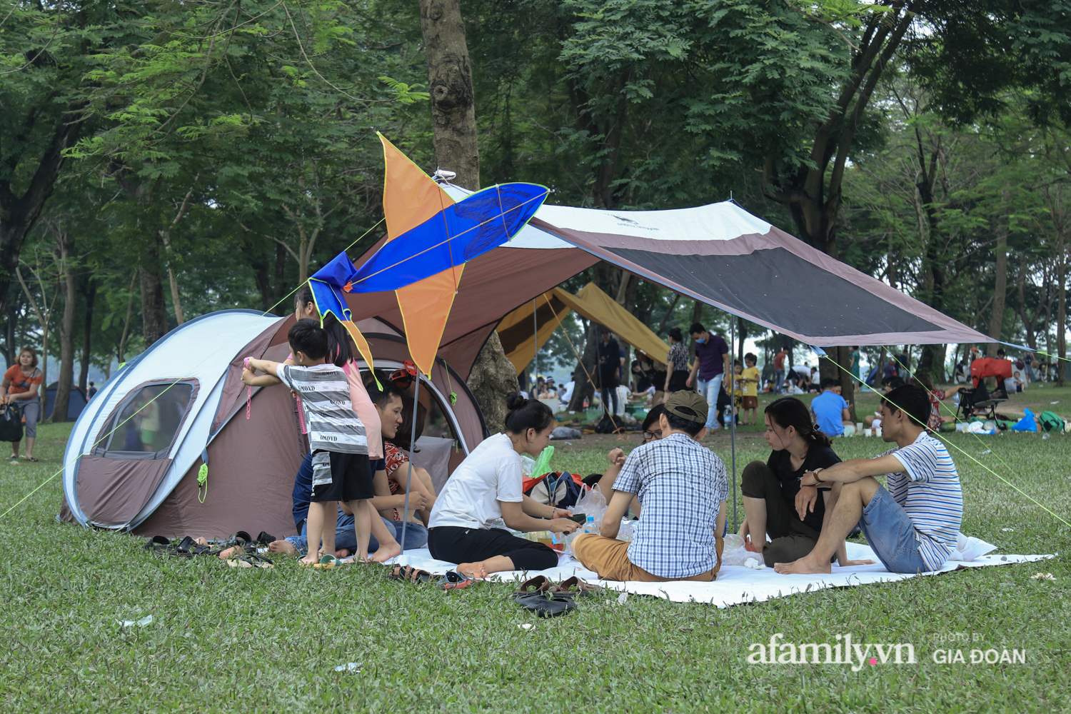 Ngại đi xa, nhiều gia đình lựa chọn công viên Yên Sở (quận Hoàng Mai, Hà Nội) làm địa điểm cắm trại vui chơi trong ngày nghỉ lễ.