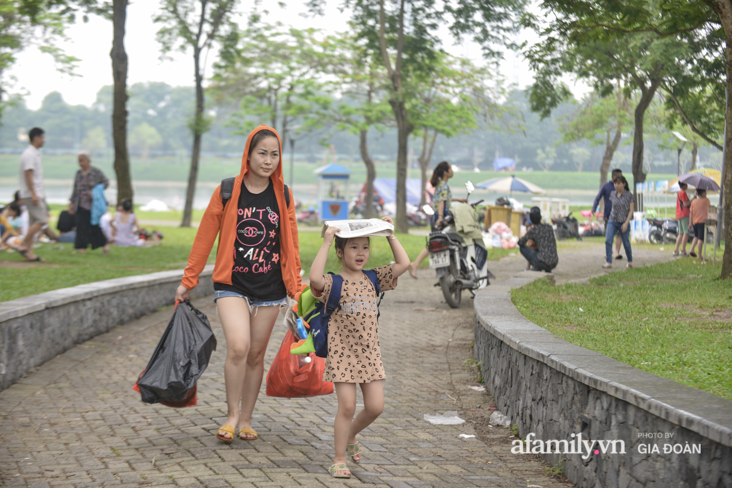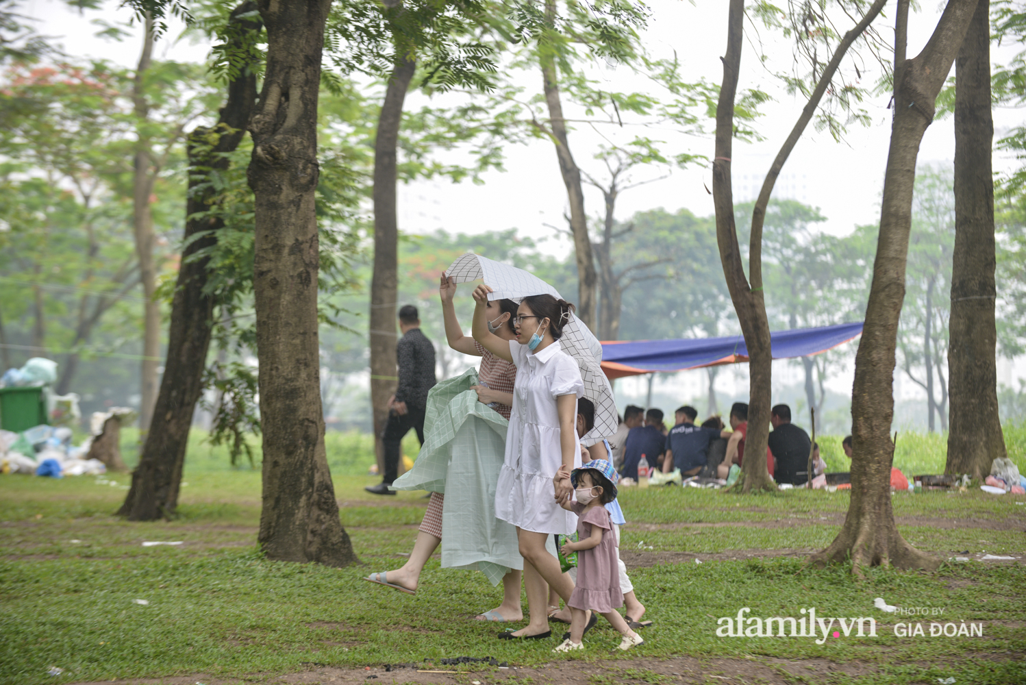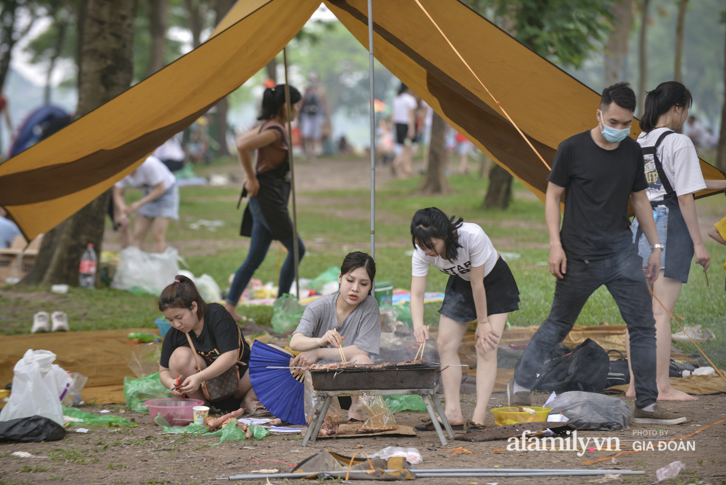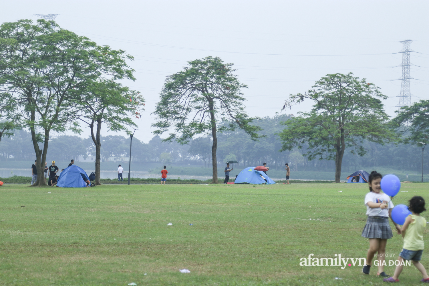 Ngại đi xa, nhiều gia đình lựa chọn công viên Yên Sở (quận Hoàng Mai, Hà Nội) làm địa điểm cắm trại vui chơi trong ngày nghỉ lễ.