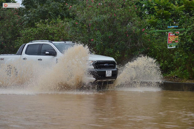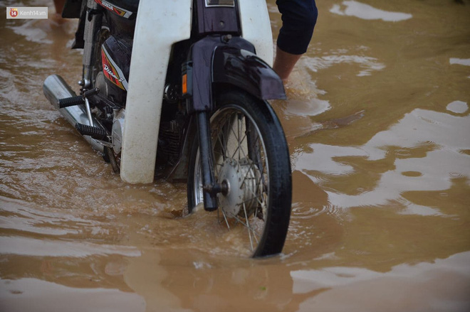 Theo ghi nhận của chúng tôi, khoảng 12h ngày 17/4, khoảng 1km đoạn đi qua địa phận Thị trấn Quốc Oai vẫn ngập lụt nghiêm trọng. Các phương tiện gặp khó khăn trong khi di chuyển, nhiều người chọn cách đi ngược chiều.