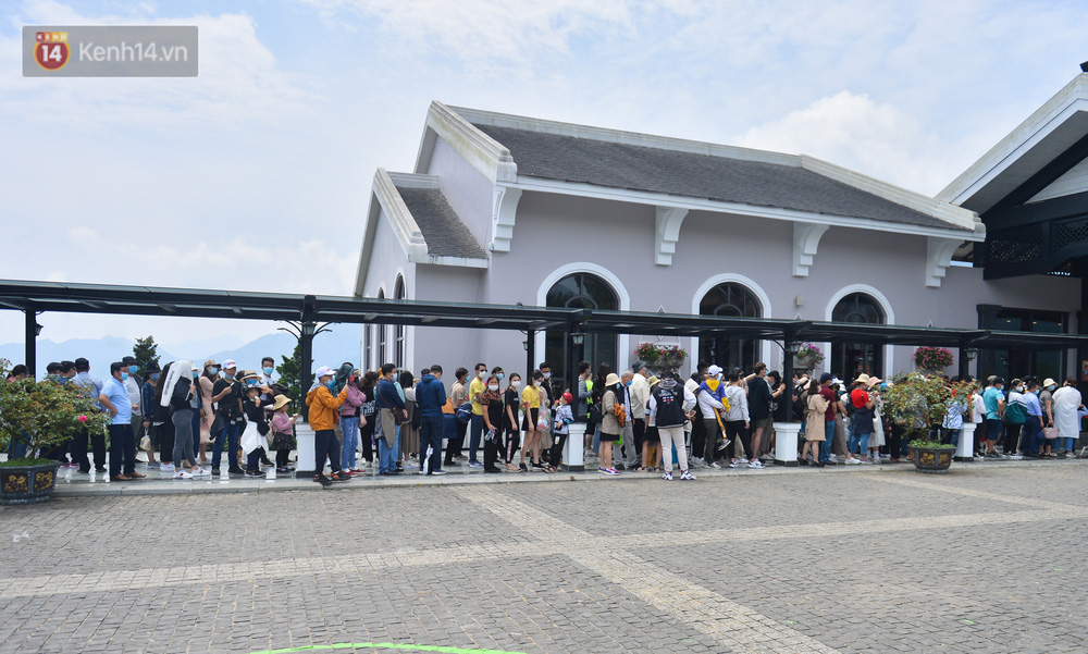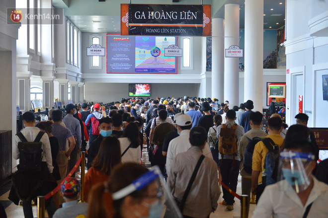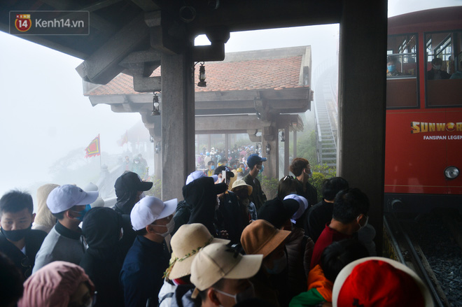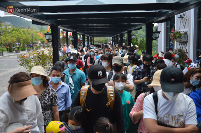 Ngay từ sáng 1/5, lượng du khách đổ về thị xã Sa Pa tăng đột biến. Tại đỉnh Fansipan, hàng nghìn người xếp hàng để chờ lên cáp treo.