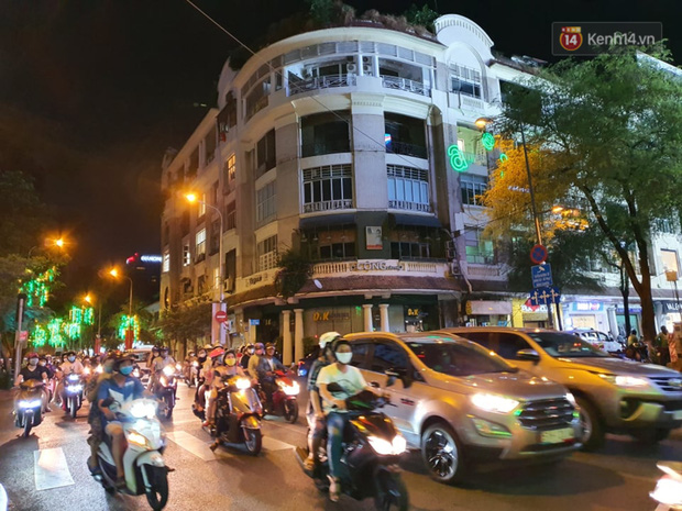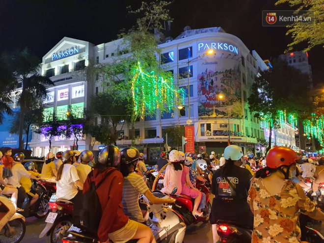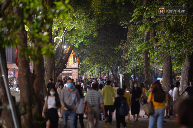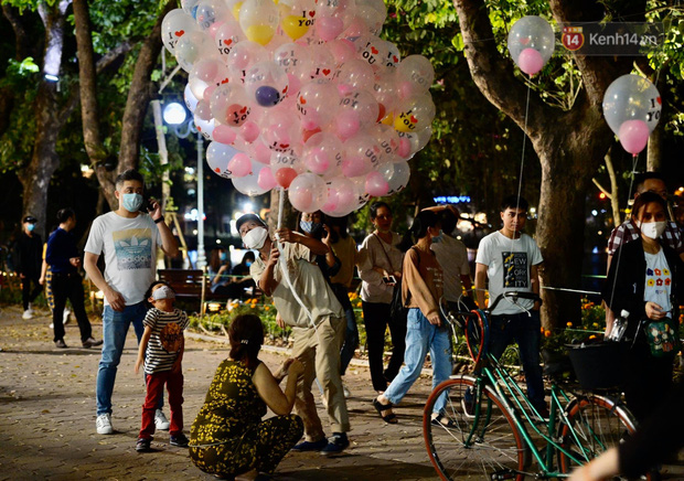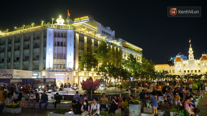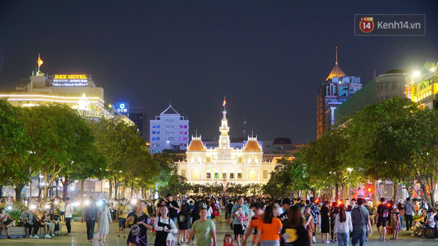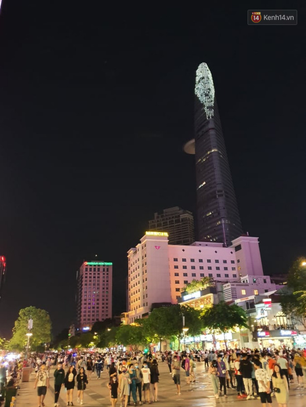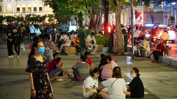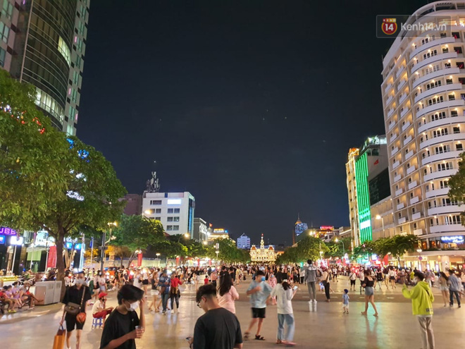 Tại phố đi bộ Nguyễn Huệ, rất đông bạn trẻ đã xuống phố cùng gia đình, bạn bè. Theo ghi nhận, hầu hết mọi người đều chấp hành tốt quy định đeo khẩu trang, phòng dịch Covid-19.