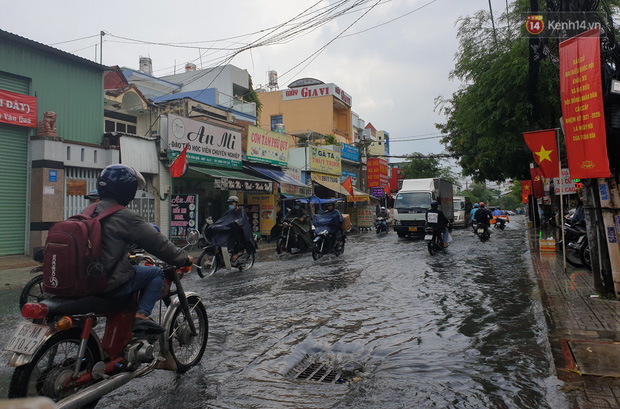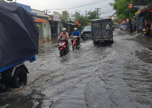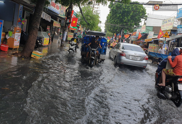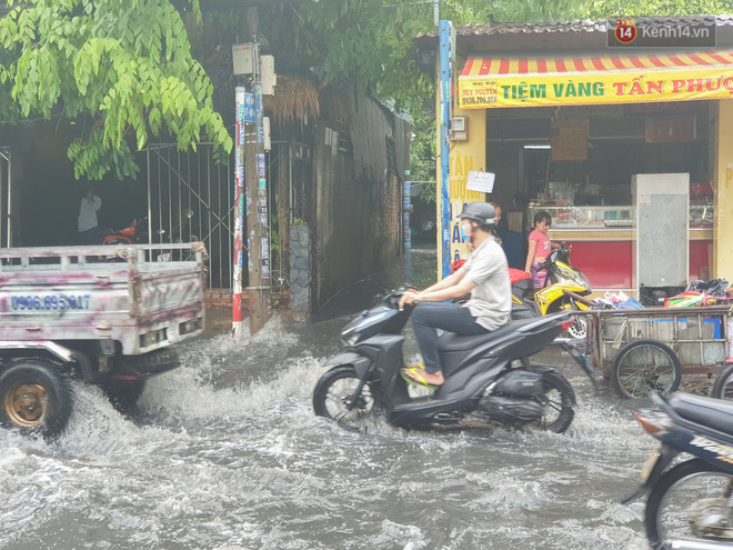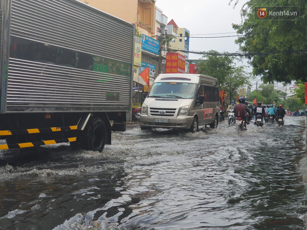 Tại đường Nguyễn Văn Quá (phường Đông Hưng Thuận, quận 12) bị ngập gần nửa bánh xe khiến nhiều phương tiện di chuyển rất vất vả.