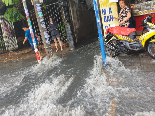Do nước lớn chảy từ trong hẻm ra ào ào, cuồn cuộn như thác đổ khiến những người dân sống tại đây không dám di chuyển, một số người đi bộ đứng chờ rút mới dám đi qua.