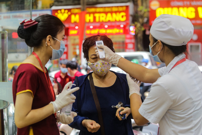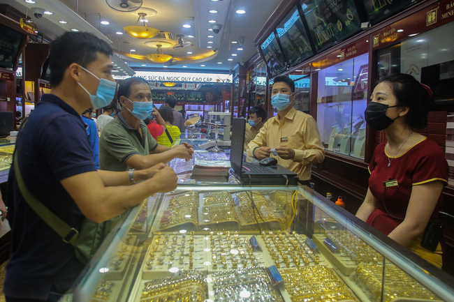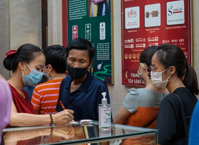 Ghi nhận trong sáng 7/8, tại các cửa hàng kinh doanh vàng trên phố Trần Nhân Tông, Hà Nội lượng người tìm đến giao dịch mua, bán vàng tăng cao. Trước diễn biến phức tạp của dịch Covid-19 khi lượng người đến giao dịch đông, các cửa hàng vẫn không quên nhiệm vụ phòng, chống dịch bằng việc hướng dẫn khách hàng sát khuẩn tay, đo thân nhiệt, đeo khẩu trang khi đến giao dịch.