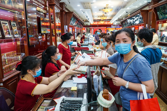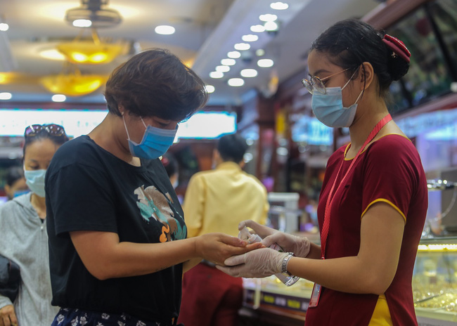 Sau khi giá vàng tăng kỉ lục 62 triệu đồng/ lượng, các cơ sở kinh doanh vàng, bạc ở Hà Nội lượng người tìm đến bán vàng tăng đột biến. Hầu hết các cửa hàng dù tiếp rất đông khách vẫn không quên nhiệm vụ hướng dẫn khách hàng sát khuẩn tay, đo thân nhiệt, đeo khẩu trang khi đến giao dịch.