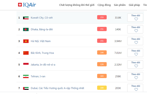 Theo tổ chức Đo chất lượng không khí thế giới (Air Visual) áp dụng cách tính AQI của Mỹ xếp hạng Hà Nội đứng thứ 3 trong những TP ô nhiễm không khí nhất thế giới vào sáng nay. Ô nhiễm không khí ở Hà Nội duy trì ở mức xấu (ngưỡng hiển thị màu đỏ), gây ảnh hưởng đến sức khỏe tất cả mọi người.