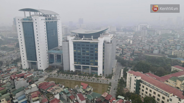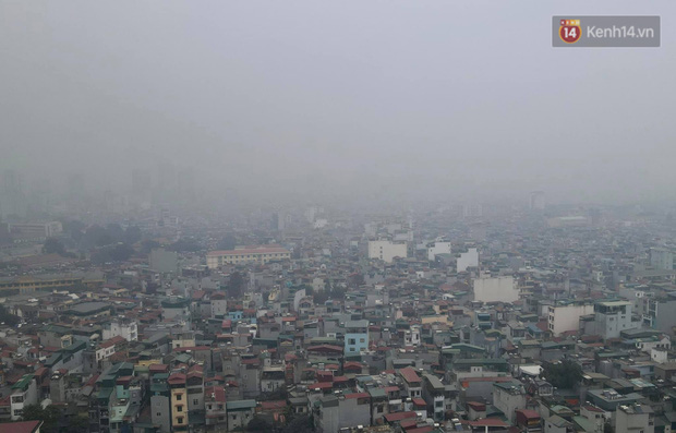 Sáng 15/1, đường phố Hà Nội chìm trong lớp sương mù dày đặc khiến nhiều nhà cao tầng "mất hút" trong sương và nhiều phương tiện phải bật đèn để đi lại trên đường phố.
