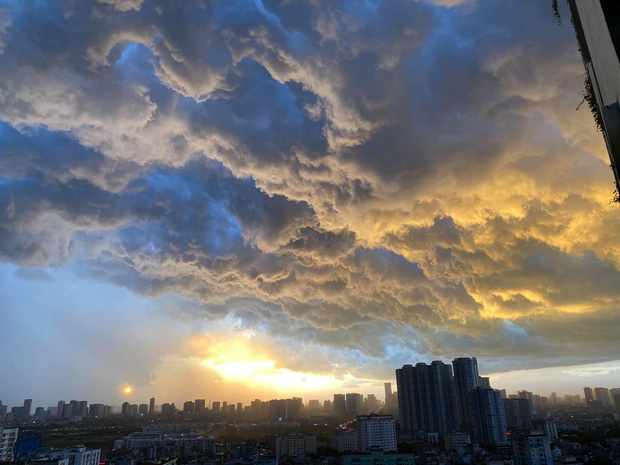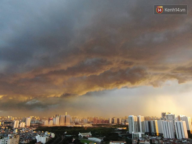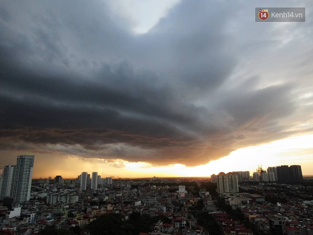 Theo đó, trước khi có cơn mưa giông ập đến, bầu trời Thủ đô xuất hiện những đám mây cuồn cuộn cùng với chút ánh nắng đổ về tạo nên khung cảnh hiếm thấy. Những cơn gió lớn nổi lên khiến nhiều cây đổ, lá rơi cùng bụi mù mịt trên một số tuyến đường. Nhiều người nhanh chóng trở về nhà.