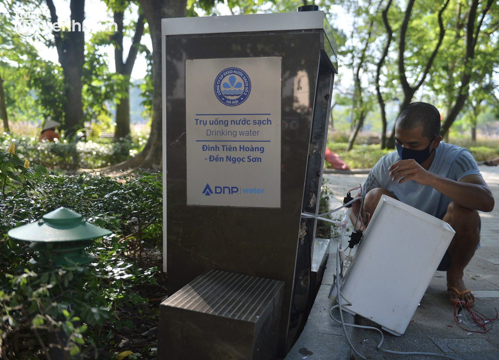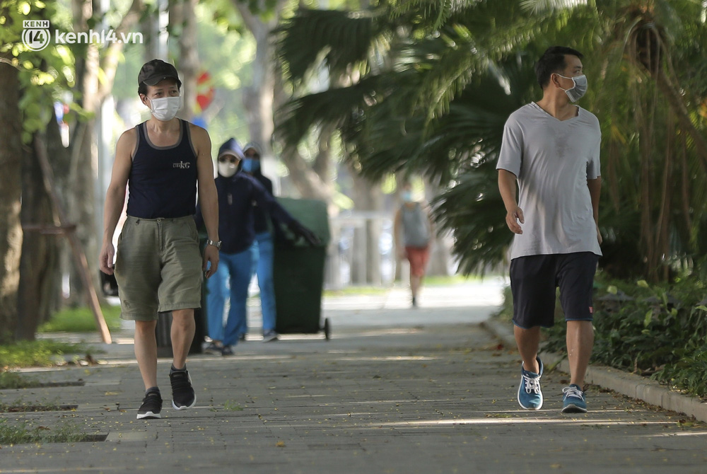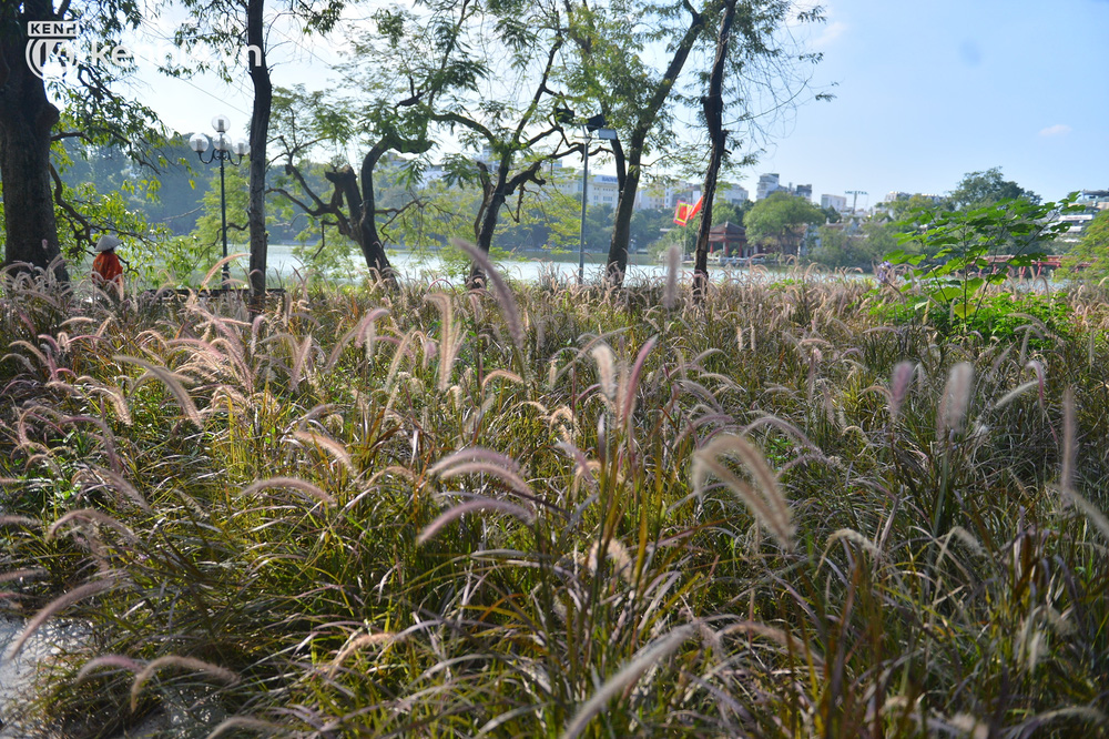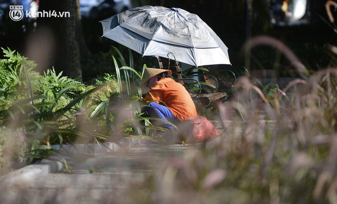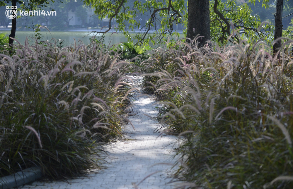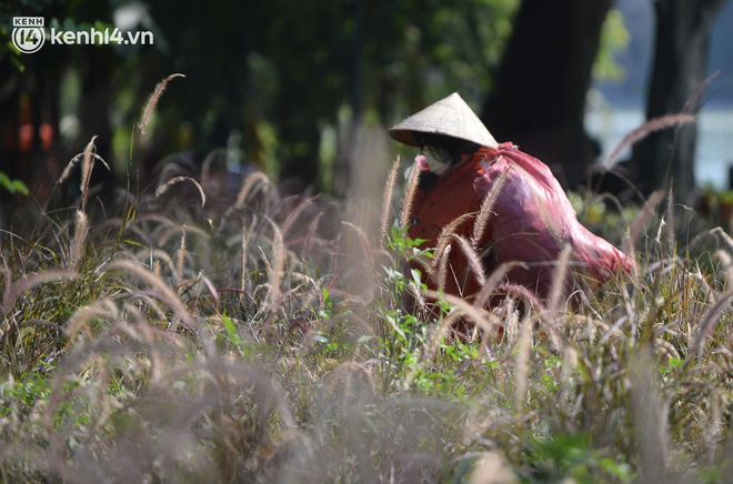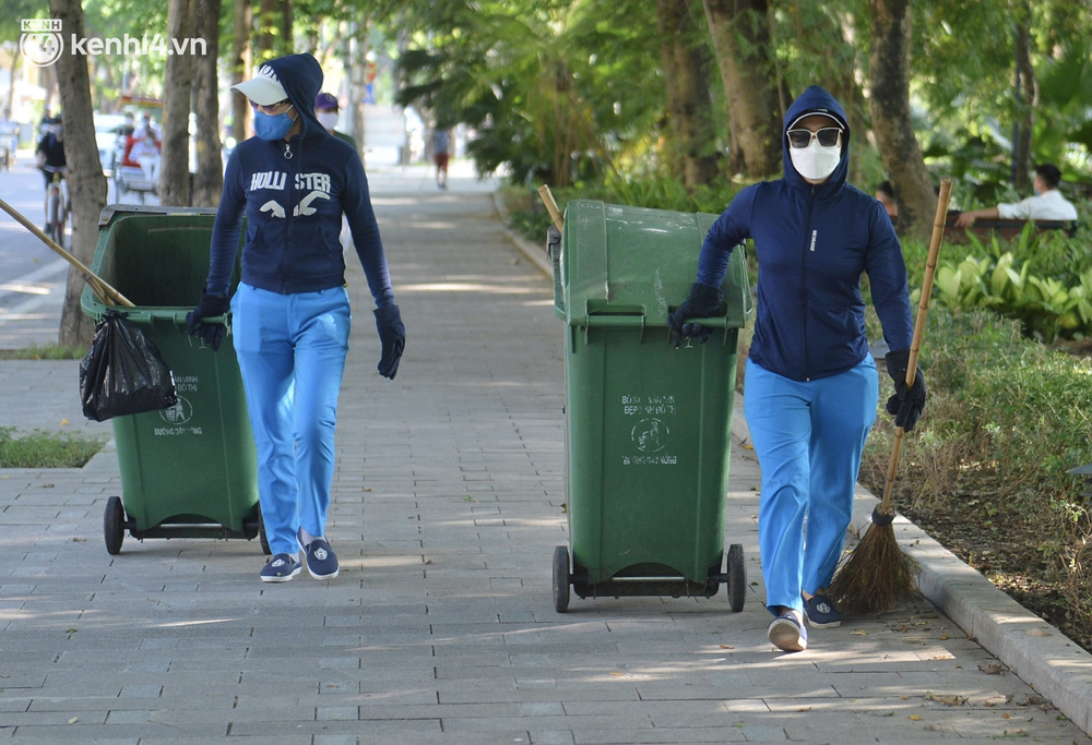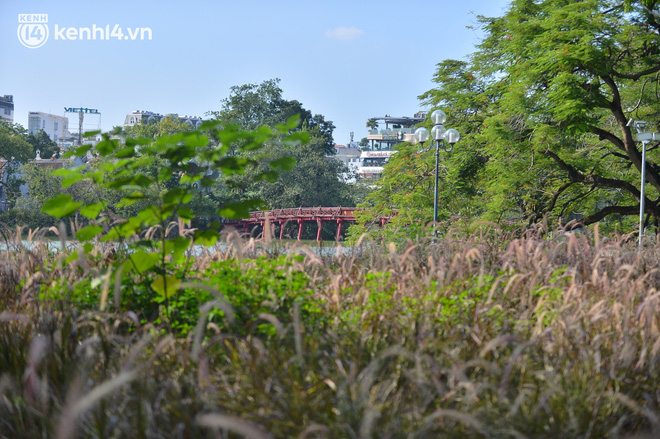 Theo ghi nhận của chúng tôi, các công nhân môi trường đang khẩn trương cắt tỉa cỏ dại xung quanh hồ Gươm sau 2 tháng Thủ đô thực hiện giãn cách xã hội.