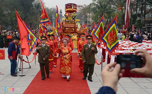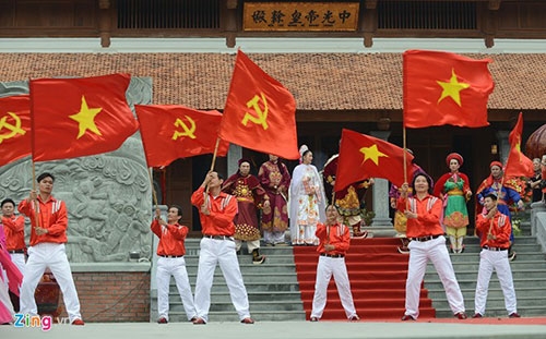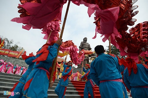 Trước đó, đông đảo các đoàn lễ rước từ Quảng Ninh, Hải Phòng, Bình Định đã rước kiệu vua Quang Trung, công chúa Lê Ngọc Hân từ ngoài vào trong công viên văn hóa gò Đống Đa. |