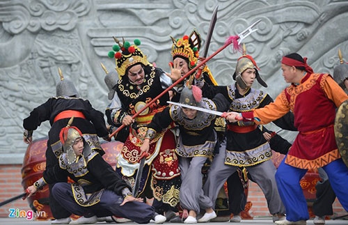 Trên sân khấu, câu chuyện lịch sử vua Quang Trung đại phá quân Thanh cũng được tái hiện lại. |
