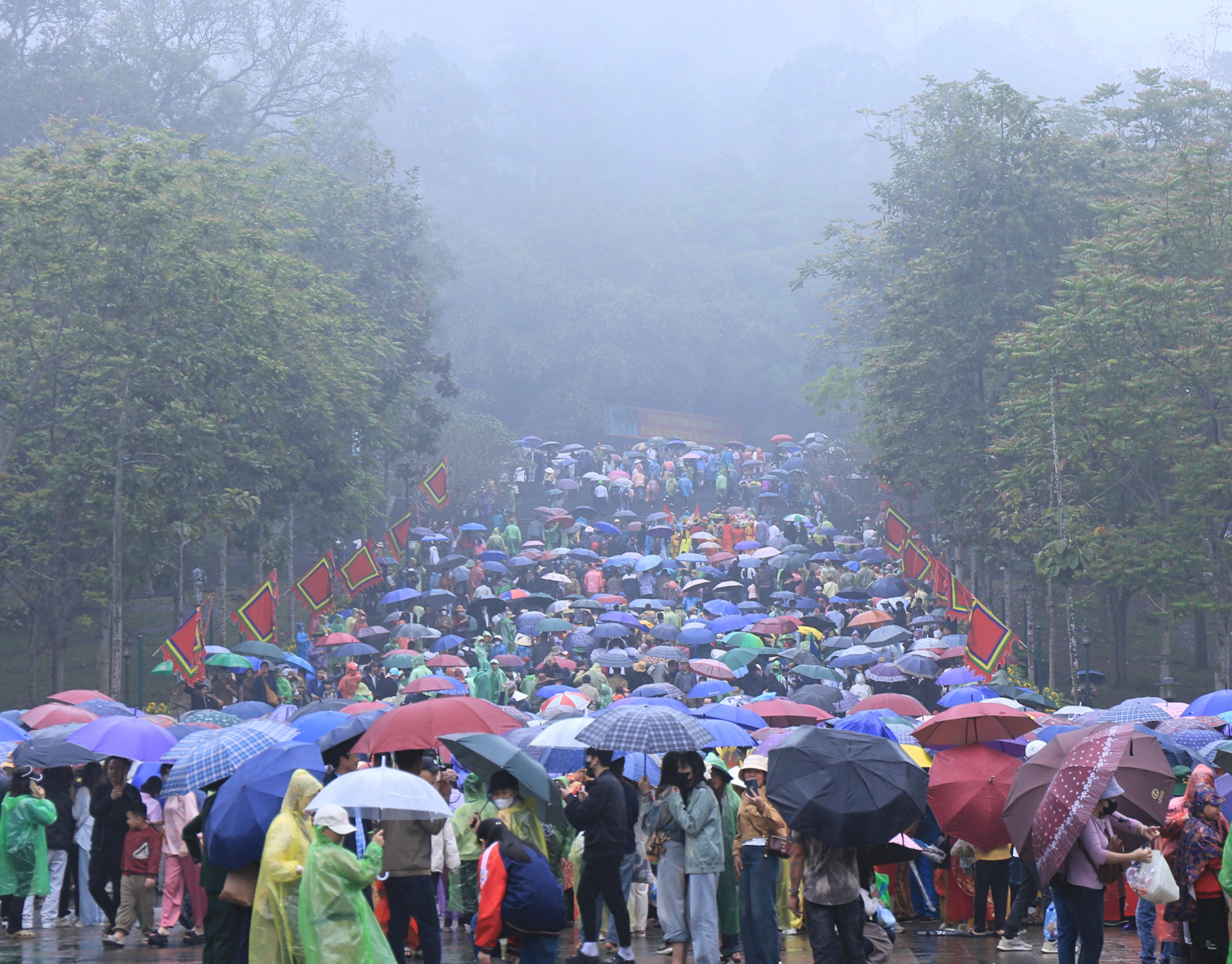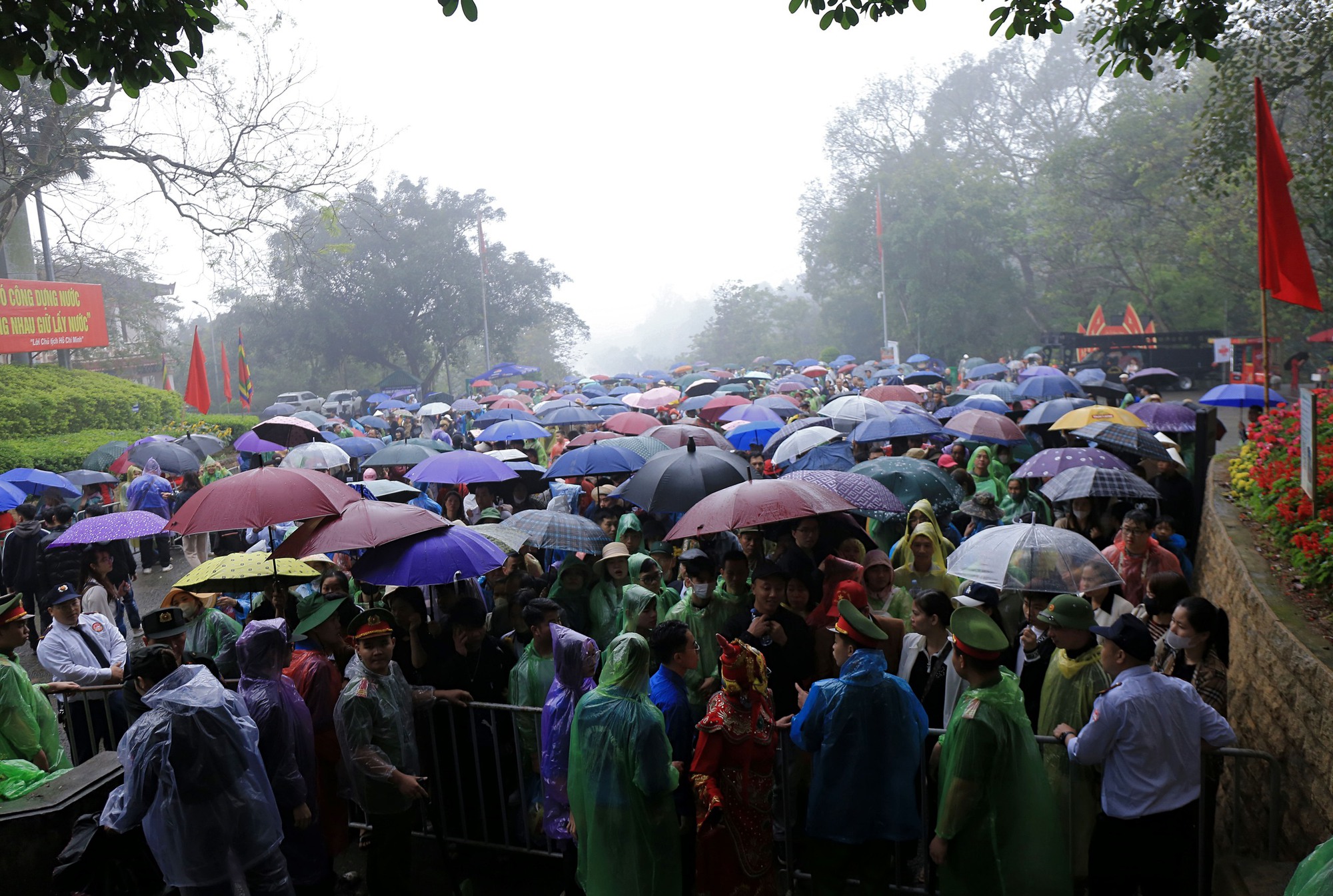 Dù thời tiết không thuận lợi, từ sáng sớm ngày 10/3 Âm lịch, hàng nghìn người dân và du khách thập phương vẫn đến Đền Hùng (Phú Thọ) để dâng hương, bày tỏ lòng thành kính.
