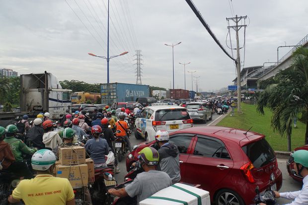 Đặc biệt, tuyến đường Xa lộ Hà Nội kéo dài gần 10km từ Suối Tiên đến cầu vượt Cát Lái, hàng nghìn ô tô và xe máy xếp hàng dài, nhích từng mét. Giao thông tại các nút giao rối loạn khiến CSGT gồng mình điều tiết hàng giờ. Nhiều tài xế đã mở cửa xuống đường đi bộ thư giãn, ngắm cảnh trong thời gian bị kẹt xe.