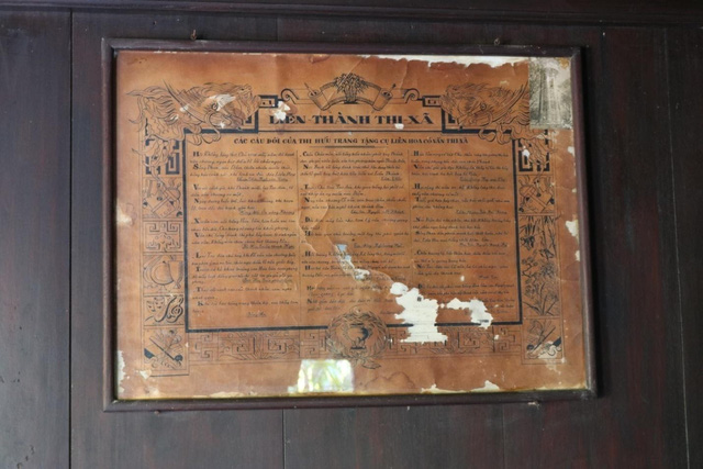 Nhà có tổng cộng 8 tấm liên và 6 tấm hoành. Nhiều tấm liên và vật dụng trong nhà đã bị lấy cắp. Trong ảnh là một tấm hoành may mắn không bị mất cắp do được treo trên cao.