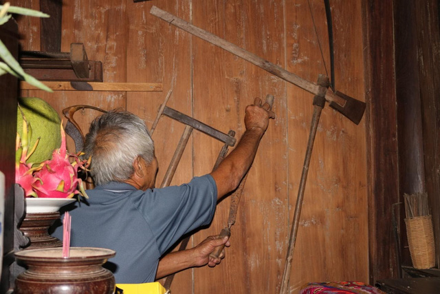 Gian thờ chính được ông Cúc sử dụng để lưu giữ nhiều nông cụ như rìu, rựa, cưa, phảng... Ông cũng có nguyện vọng nếu chính quyền thành phố giúp sức trùng tu ngôi nhà thành điểm tham quan, ông sẽ có dịp giới thiệu đến du khách những vật dụng này.