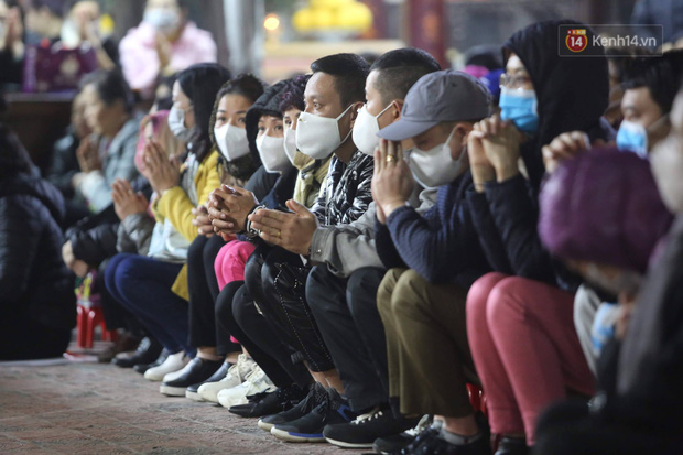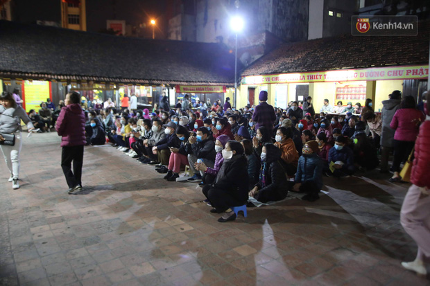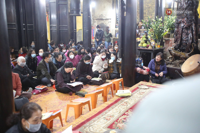 Trong buổi làm lễ cầu an tối 31/1 tại chùa Phúc Khánh (Hà Nội) nhiều người dân đeo khẩu trang để đọc kinh cầu nguyện. Năm nay, mỗi buổi cầu an nhà chùa quy định danh sách khoảng 3.000 người, lượng người vừa đủ ngồi trong khuôn viên của chùa để chấm dứt tình trạng người dân tràn ra cả lòng đường vái vọng.