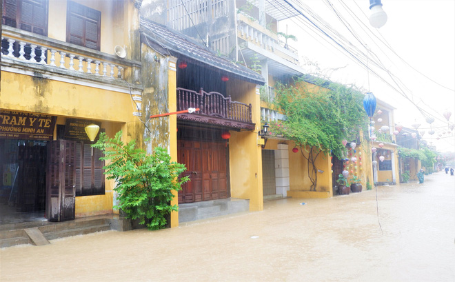 Chiều 10/10, người dân đang hối hả dọn dẹp hàng quán, tài sản để phòng nước lũ sẽ tiếp tục dâng cao trong đêm. Trong khi đó, một số du khách đến phố cổ lần này đã tranh thủ lội nước để chụp ảnh kỷ niệm.