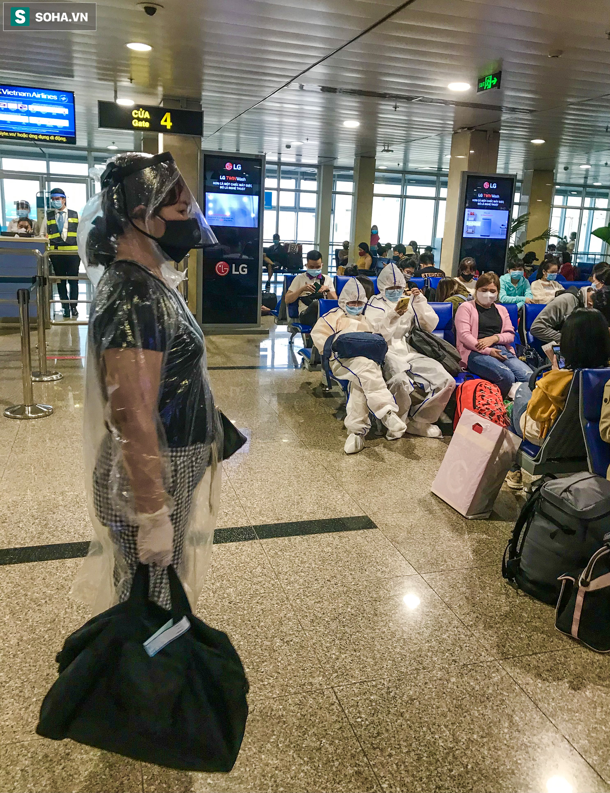 Trước tình hình dịch SARS-CoV-2 phức tạp, nhiều người dân tự trang bị áo mưa, đồ bảo hộ kín mít trước khi ra sân bay để về quê đón Tết.