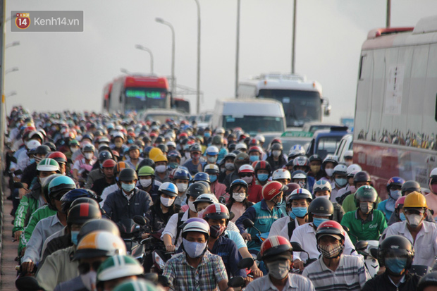 Tại khu vực cầu Bình Triệu, hàng ngàn phương tiện nối đuôi nhau, chen chúc trên đường hướng về phía trung tâm thành phố. Cảnh kẹt xe kéo dài khiến cho nhiều người phải leo lên lề của cầu, cố tìm cách thoát khỏi cảnh kẹt xe để kịp giờ làm.