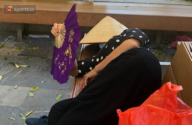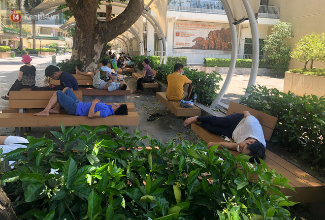 Giữa trời nắng gần 50 độ C, người nhà bệnh nhân ở bệnh viện Bạch Mai tỏ ra mệt mỏi, nằm vật vờ phía ngoài khuôn viên bệnh viện để nghỉ trưa.