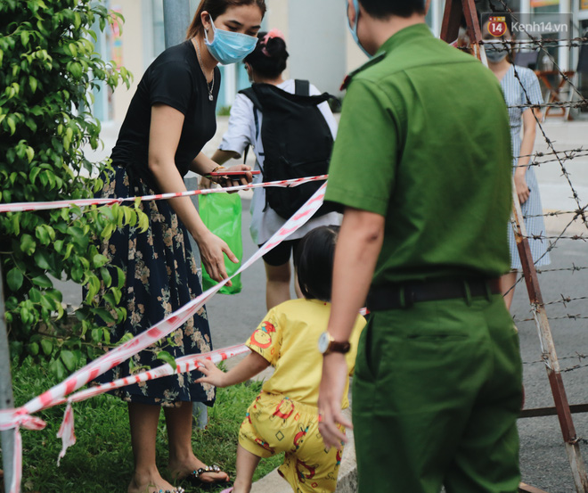 Vừa được người thân đưa về đến chung cư thấy mẹ đứng trước hàng rào cách ly, các bé vui mừng chạy lại ôm mẹ. Cũng như những đứa trẻ khác, khi vào trong bé gái sẽ phải ở lại khu cách ly với mẹ theo quy định.