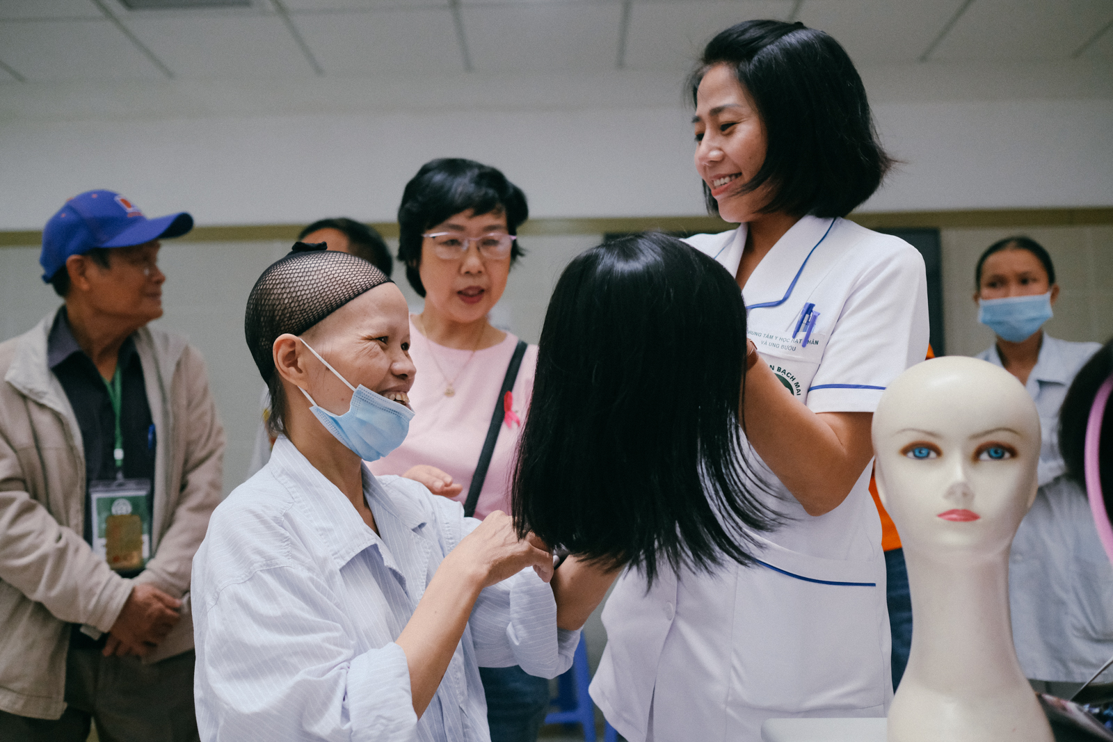 Tại Bệnh viện Bạch Mai (Hà Nội) hàng chục bệnh nhân mắc bệnh ung thư vú và ung thư nói chung đã nhận được niềm vui khi được phát tận tay những bộ tóc giả miễn phí.