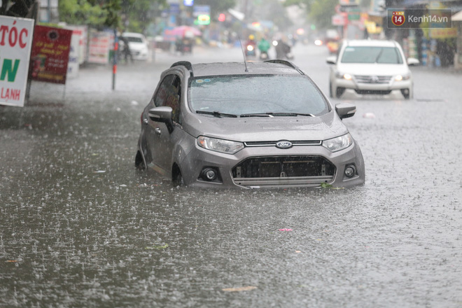 Do bị chết máy, ô tô trôi bồng bềnh trên đường ngập mỗi khi có phương tiện khác chạy nhanh, tạo sóng. Không chỉ ô tô mà xe máy cũng chết máy hàng loạt khiến người điều khiển bất lực.