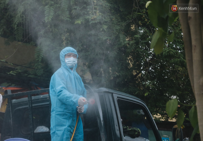 "Hôm nay, chúng tôi sẽ phun hoá chất khử khuẩn trên 4 tuyến đường. Với dung tích hoá chất được pha với tỉ lệ 720gram Cloramin/10 lít nước. Trung bình một tuyến đường phun khử khuẩn khoảng 5 bình hoá chất loại 500 lít, tuỳ theo tiến độ và mật độ dân cư", Thượng uý Trung cho hay.
