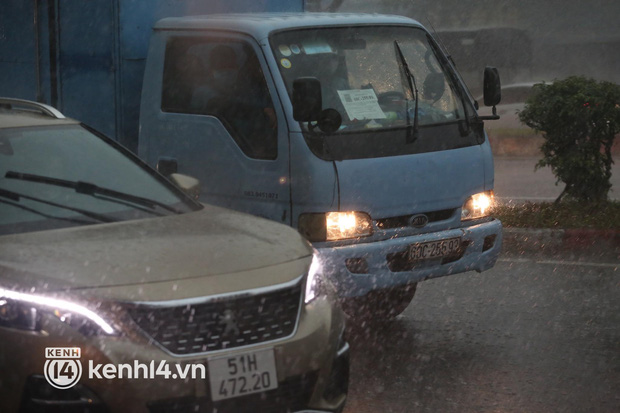 20/10/2021 21:59Ảnh: Sài Gòn mưa tầm tã, trời tối sầm dù mới đầu giờ chiều, ô tô và xe máy phải bật đèn di chuyển