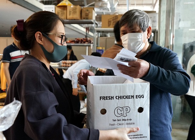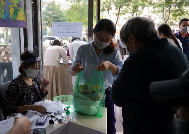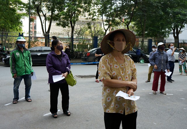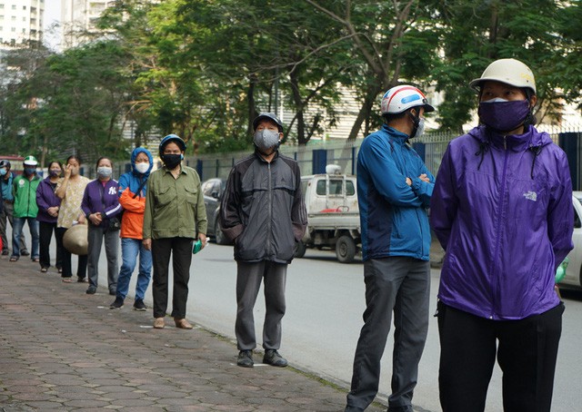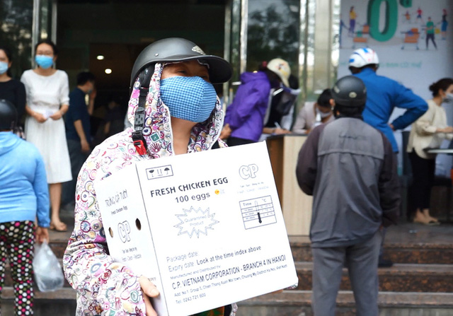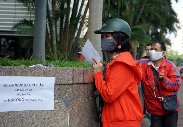 Chị Nguyễn Thị Minh (35 tuổi) ôm đứa con nhỏ trên tay đứng xếp hàng gần 1 tiếng cho biết, bản thân gia đình mình vô cùng khó khăn, vì dịch bệnh nên chồng mất việc, bản thân mới sinh con nên cả gia đình lo ăn hàng ngày chật vật. Chị nói: "Cuộc sống vô cùng khổ cực nên em phải xếp hàng để mua gạo, mua mì nấu cho con và gia đình ăn".
