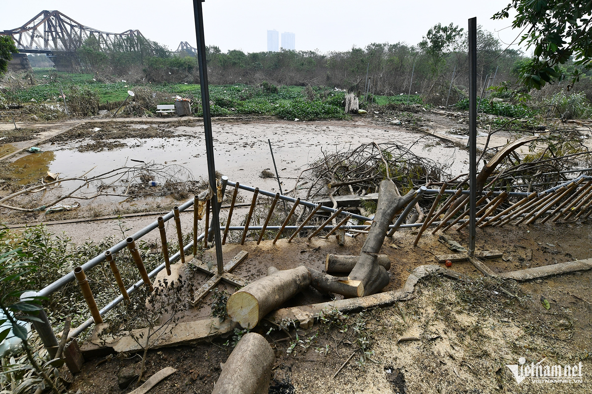 Sau khi nước lũ rút, dòng chảy bắt đầu êm đềm, bãi giữa sông Hồng và khu dân cư gần chân cầu Long Biên và Chương Dương (Hà Nội) hiện lên ngập rác thải.