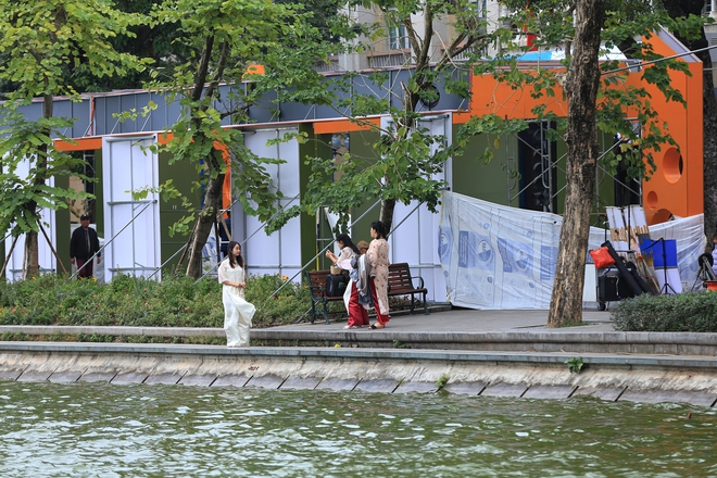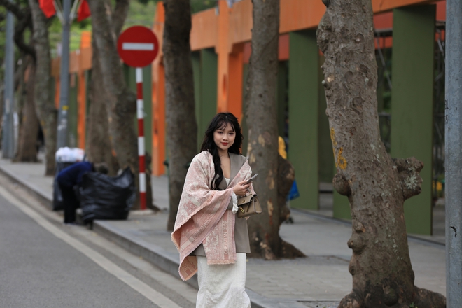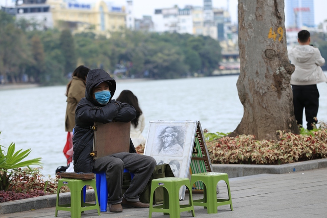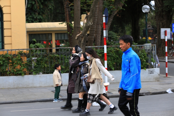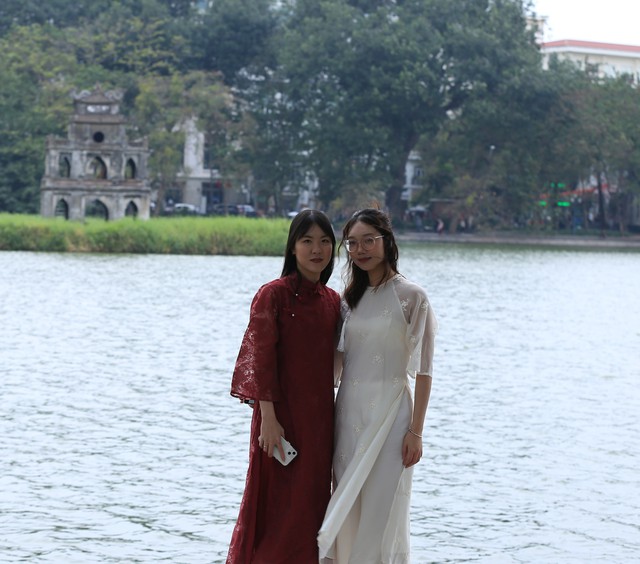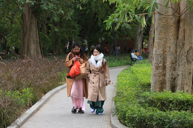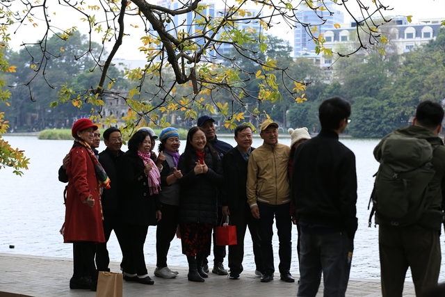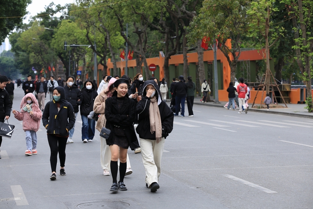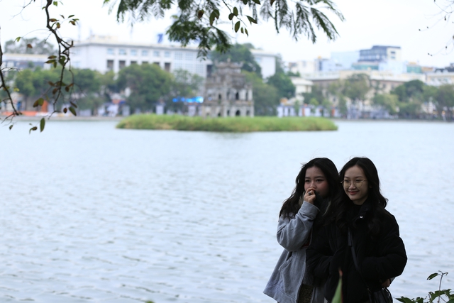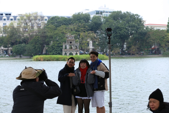 Dù nhiệt độ Hà Nội hôm nay giảm sâu, chỉ còn 10-14 độ C nhưng nhiều bạn trẻ và du khách vẫn không ngại lạnh kéo về Hồ Gươm.
