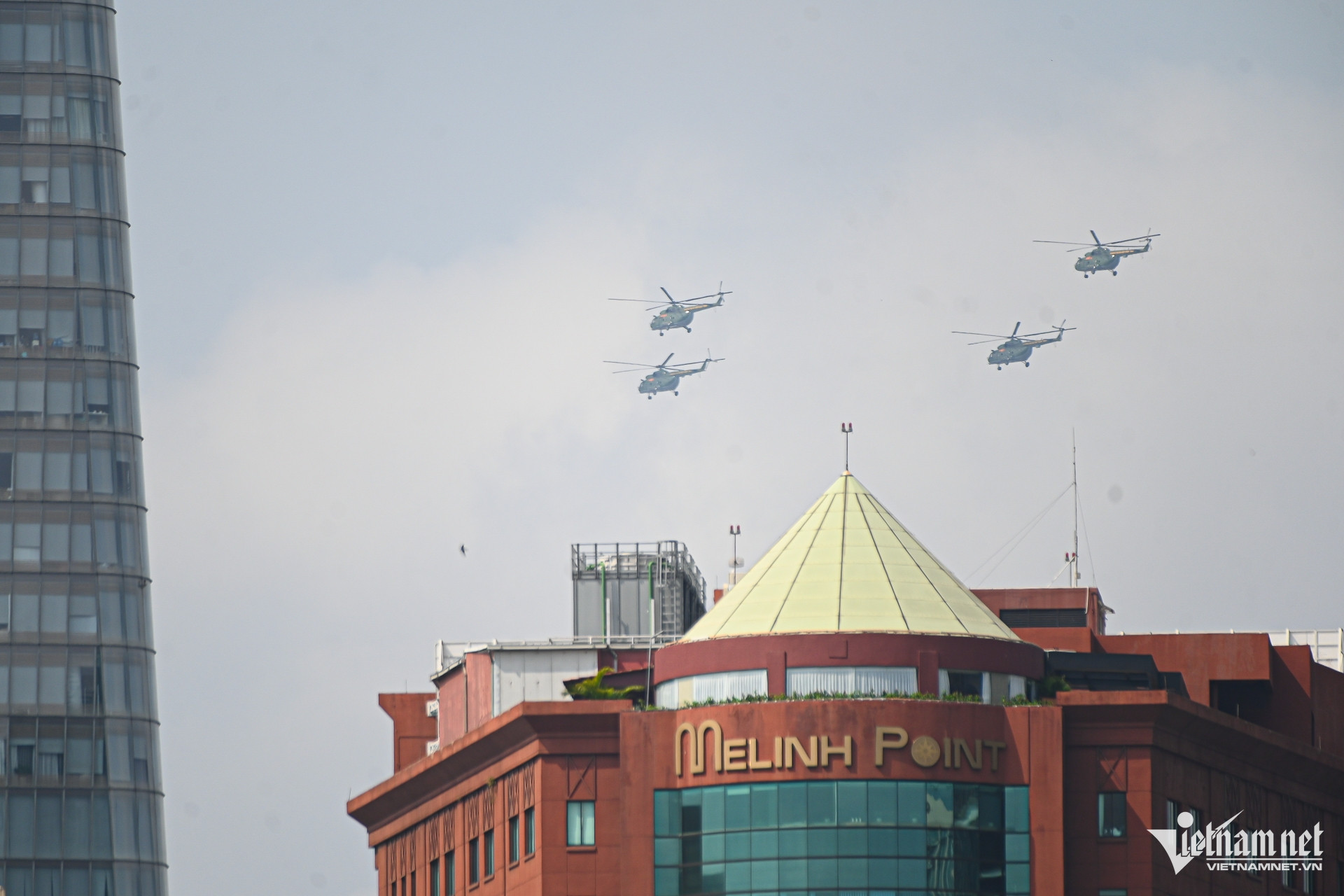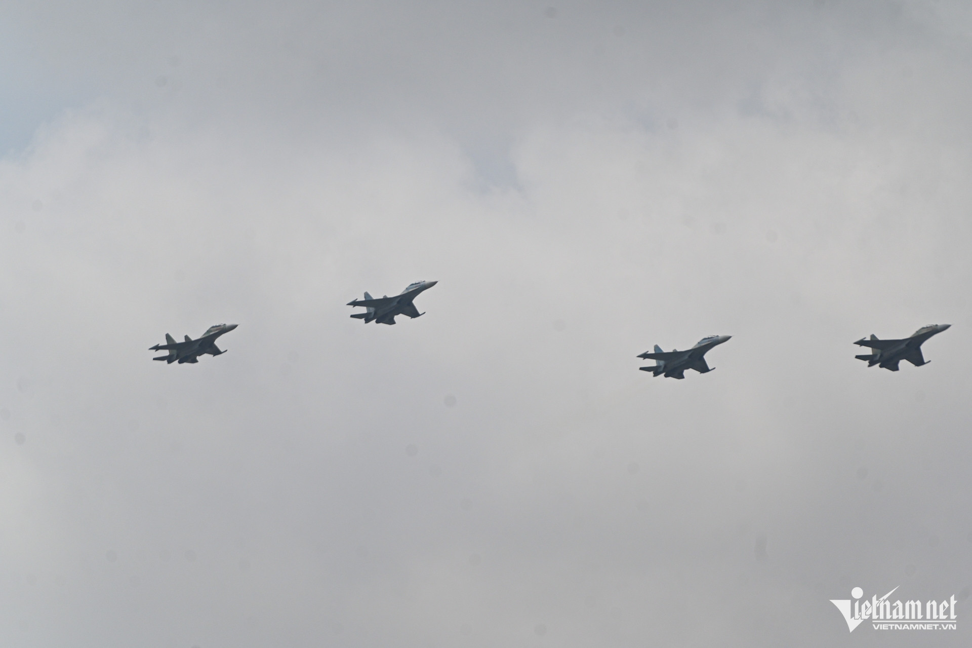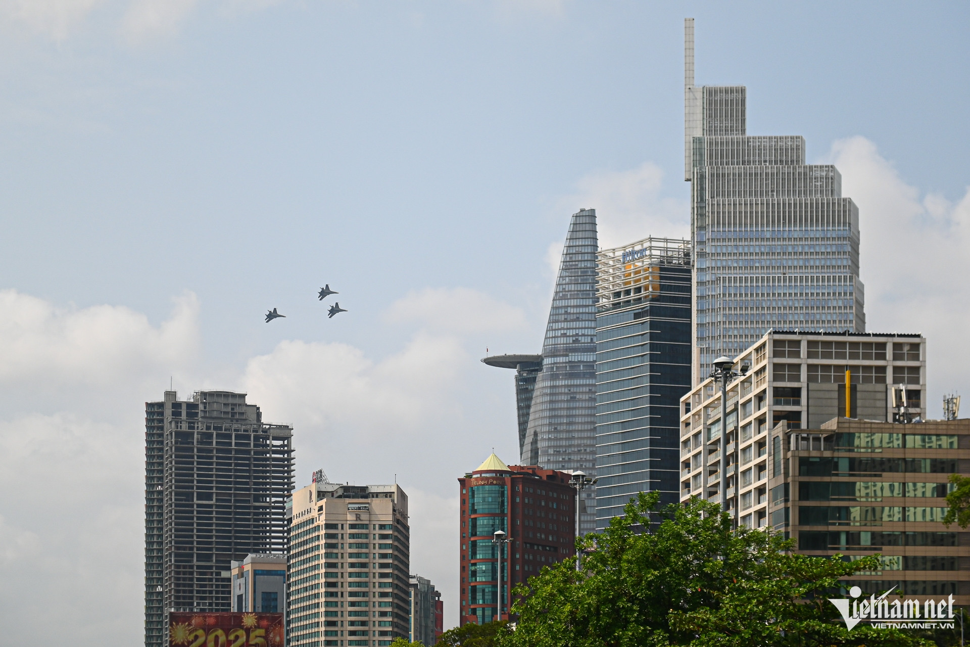 Để chuẩn bị cho màn trình diễn dịp Lễ kỷ niệm 50 năm thống nhất đất nước, hàng chục tiêm kích Su-30MK2, Yak-130, trực thăng bay tập luyện trên bầu trời khu trung tâm TPHCM.