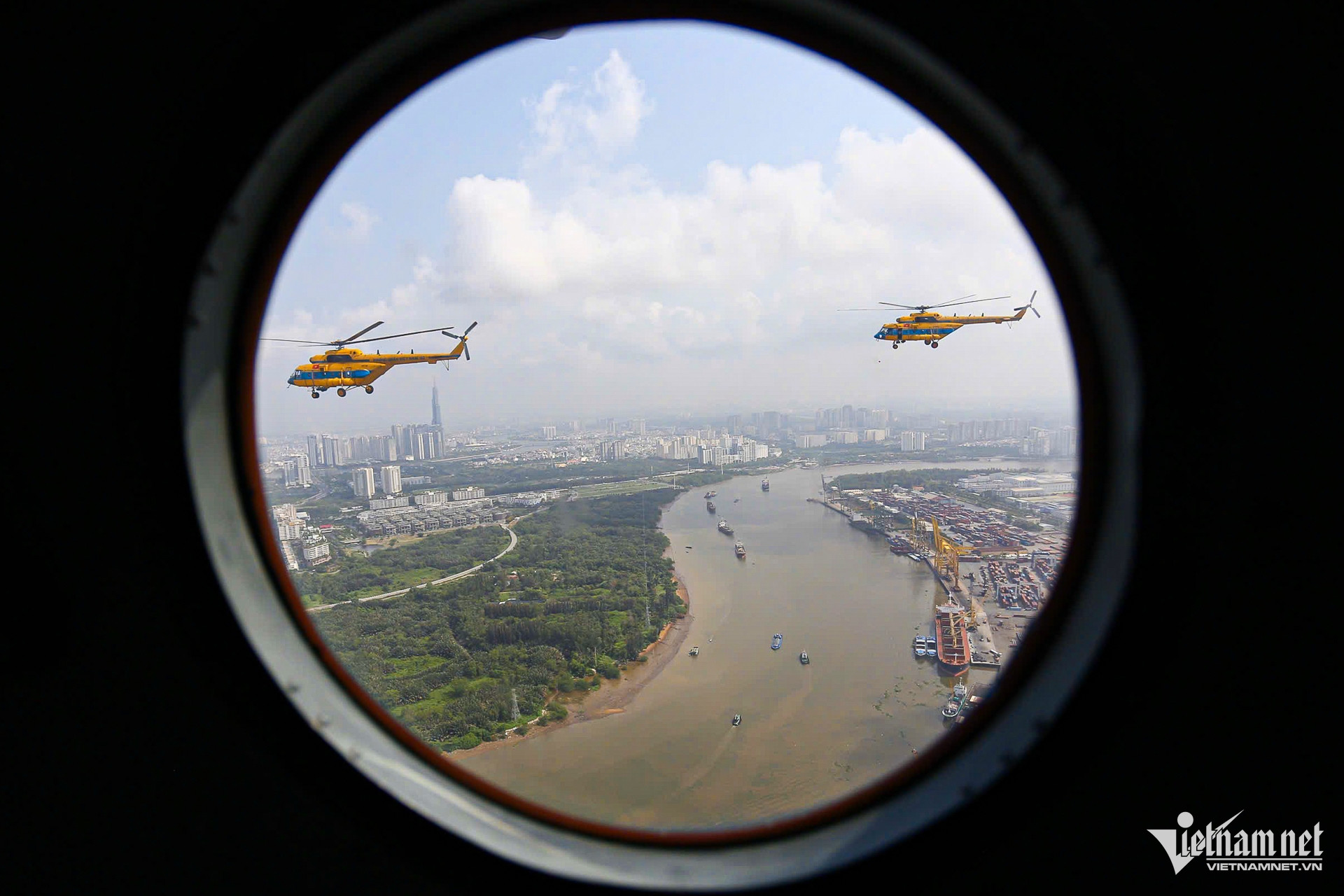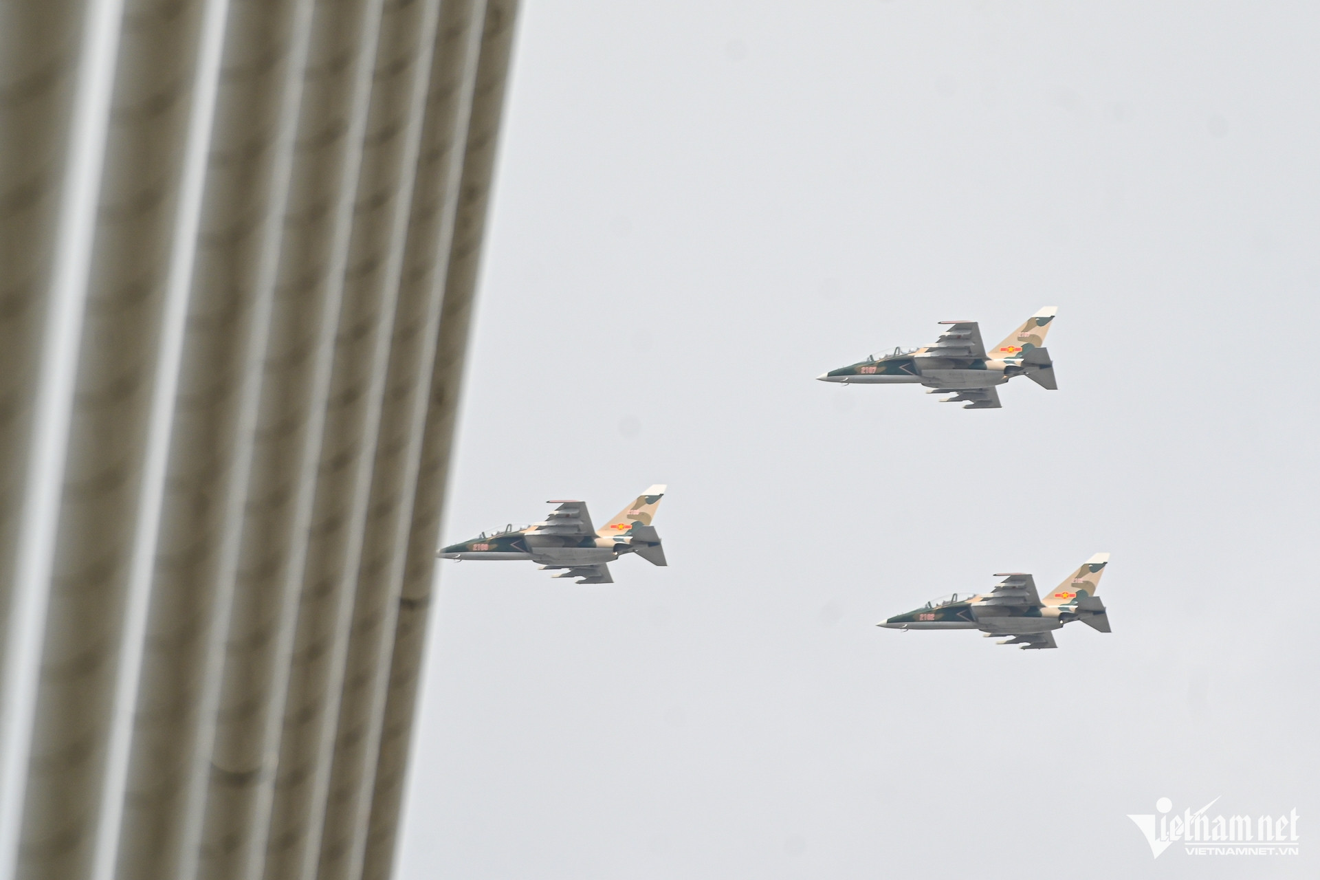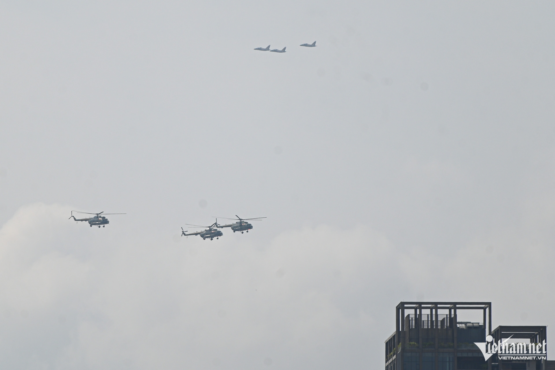 Để chuẩn bị cho màn trình diễn dịp Lễ kỷ niệm 50 năm thống nhất đất nước, hàng chục tiêm kích Su-30MK2, Yak-130, trực thăng bay tập luyện trên bầu trời khu trung tâm TPHCM.