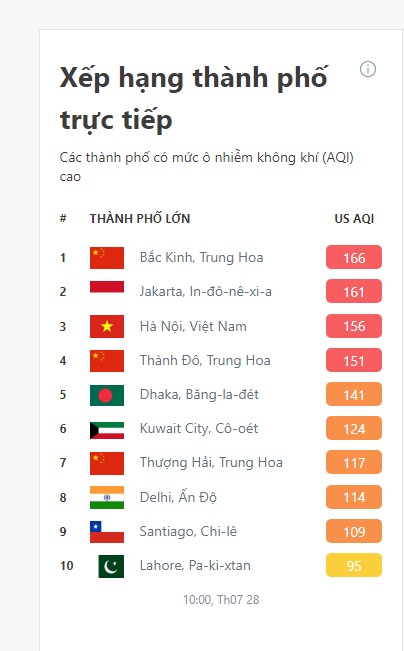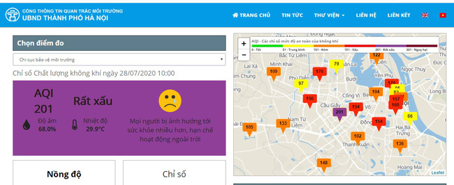 Sáng nay 28/7, không khí ở thủ đô Hà Nội lại ô nhiễm trở lại, ghi nhận lúc 10h chỉ số ô nhiễm nằm trong top 3 thế giới (theo Airvisual), các chỉ số ô nhiễm tại một số khu vực ở ngưỡng tím - ảnh hưởng rất xấu cho sức khỏe con người.
