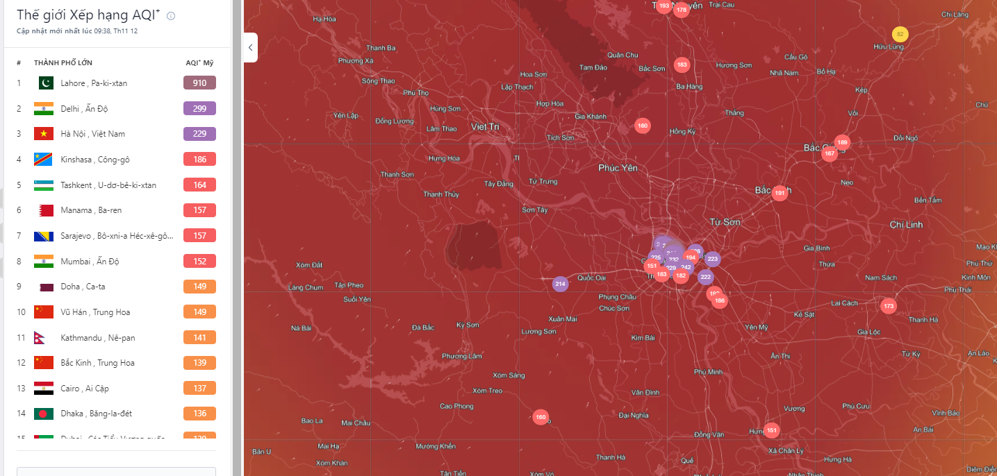 Sáng 12/11, bầu trời Hà Nội bị bao phủ bởi lớp sương mù dày đặc. Đến 9 giờ sáng, chỉ số chất lượng không khí (AQI) đạt 229, mức có hại cho sức khỏe; riêng tại khu vực Tây Hồ, chỉ số AQI đạt mức từ 336 - 398.
