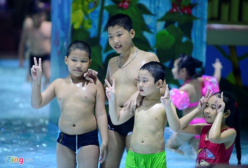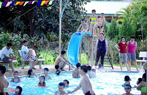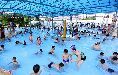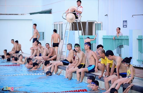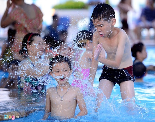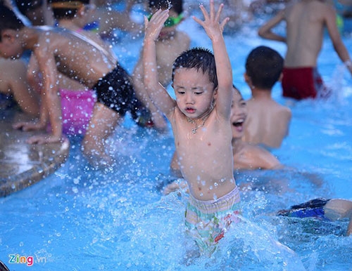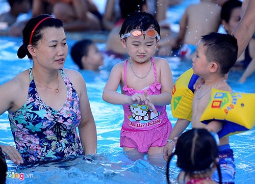 Những ngày nắng nóng 40 độ C, khu bơi lội thuộc Cung thể thao dưới nước (Mỹ Đình, Hà Nội) với 4 bể trong nhà và ngoài trời luôn đông đúc, đặc biệt là vào buổi chiều. |