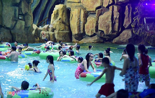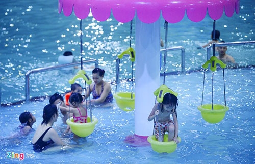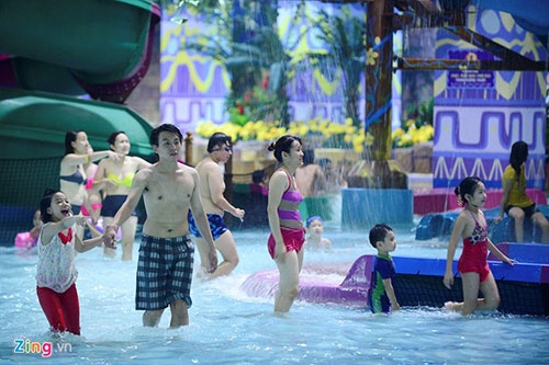 Cũng trong chiều 31/5, nhân dịp ngày Quốc tế thiếu nhi, nhiều gia đình đưa trẻ em đến công viên nước dưới lòng đất Royal City tắm. Giá vé vào cửa khá cao (từ 150.000-220.000 đồng/người) nhưng không vì thế mà nơi đây vắng khách. |