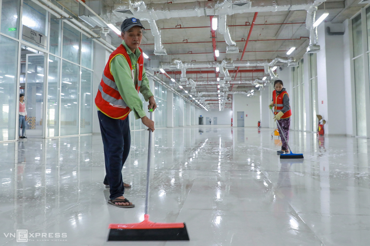 Bên trong tòa nhà, các công nhân tiến hành lau chùi nền gạch.
