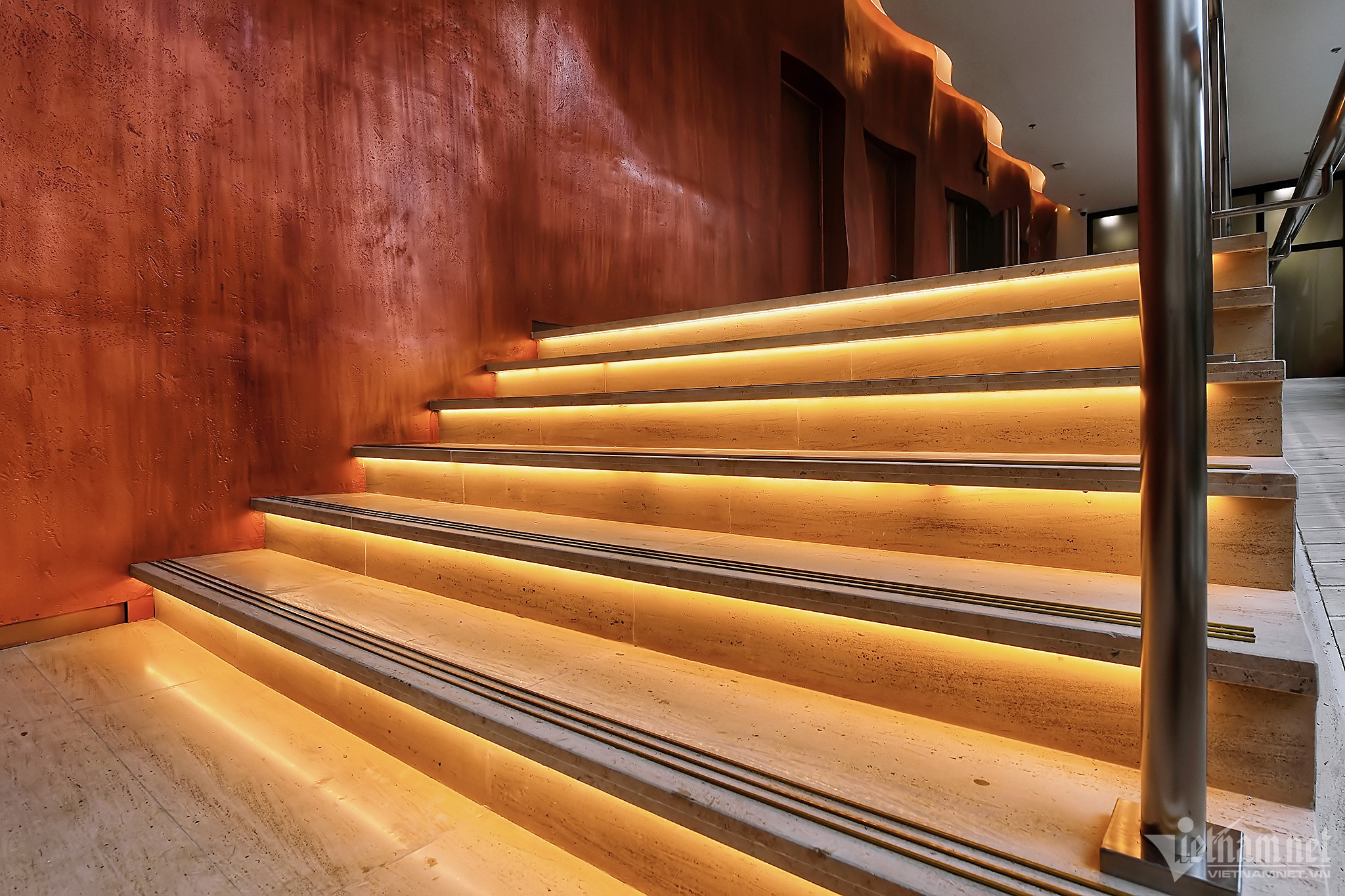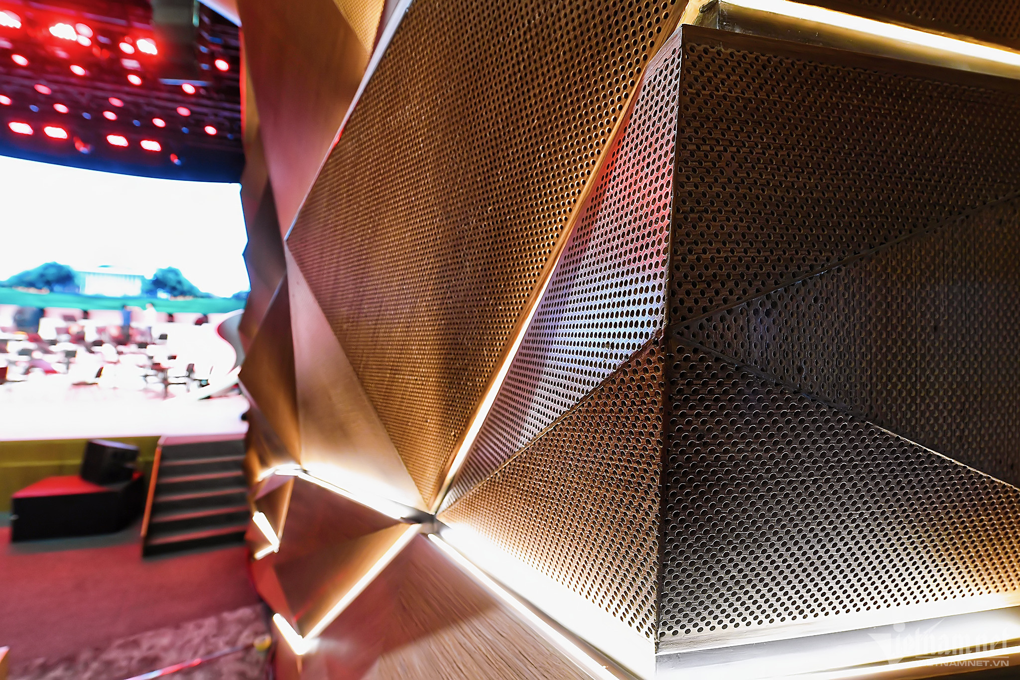 Các bậc tam cấp xung quanh sảnh được trang trí dải đèn Led tạo cho khán giả có cảm giác sang trọng, hiện đại ngay từ khi bước chân vào.