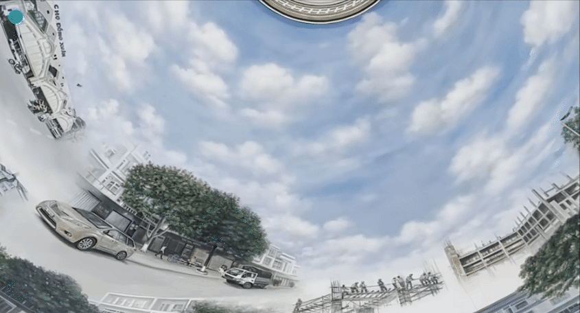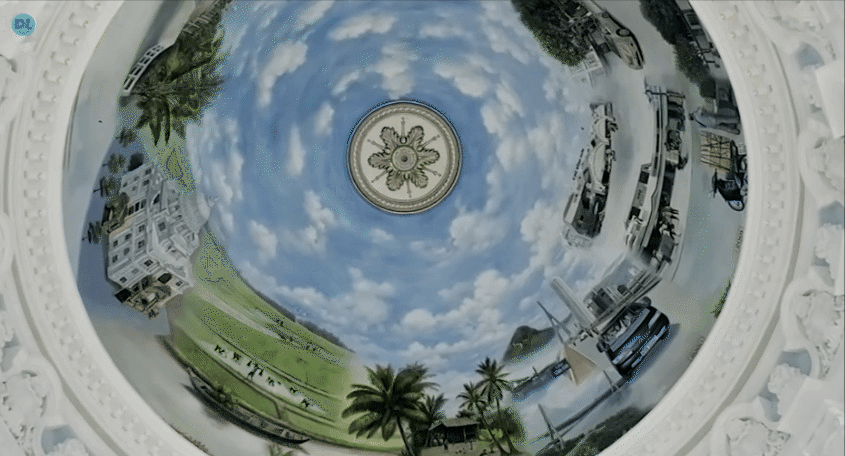 Bức tranh trên mái vòm thu hút sự quan tâm của rất nhiều người. Từ thuở còn chân lấm tay bùn cho đến thành công như bây giờ, gia chủ đã gặp nhiều khó khăn, gian nan, câu chuyện được kể lại qua nét vẽ của họa sĩ, và gia chủ cũng không ngại chia sẻ từng mốc thời gian khi ông còn là người nông dân làm ruộng vườn, lấy vợ, làm nhân viên tiếp thị rồi mở xưởng kinh doanh...