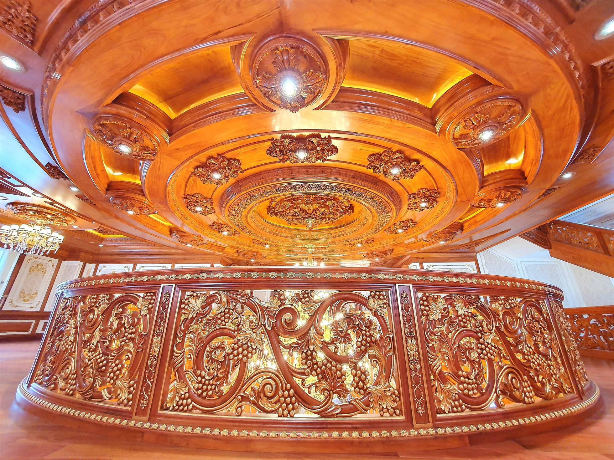 Bước vào bên trong, người xem thật sự choáng ngợp trước không gian tầng 1 của căn biệt thự. Nổi bật nhất là chiếc cầu thang gỗ, dát vàng 24K . Cầu thang chính giữa sảnh được xây dựng uốn lượn theo phong cách cổ điển, được lấy cảm hứng từ bộ phim “Cô dâu 8 tuổi” dài 2.248 tập của Ấn Độ. Nội thất gỗ trong biệt thự được làm từ gỗ đỏ của Lào, gia chủ tiết lộ, ước tính cũng phải vài trăm khối gỗ để làm nội thất trong nhà.