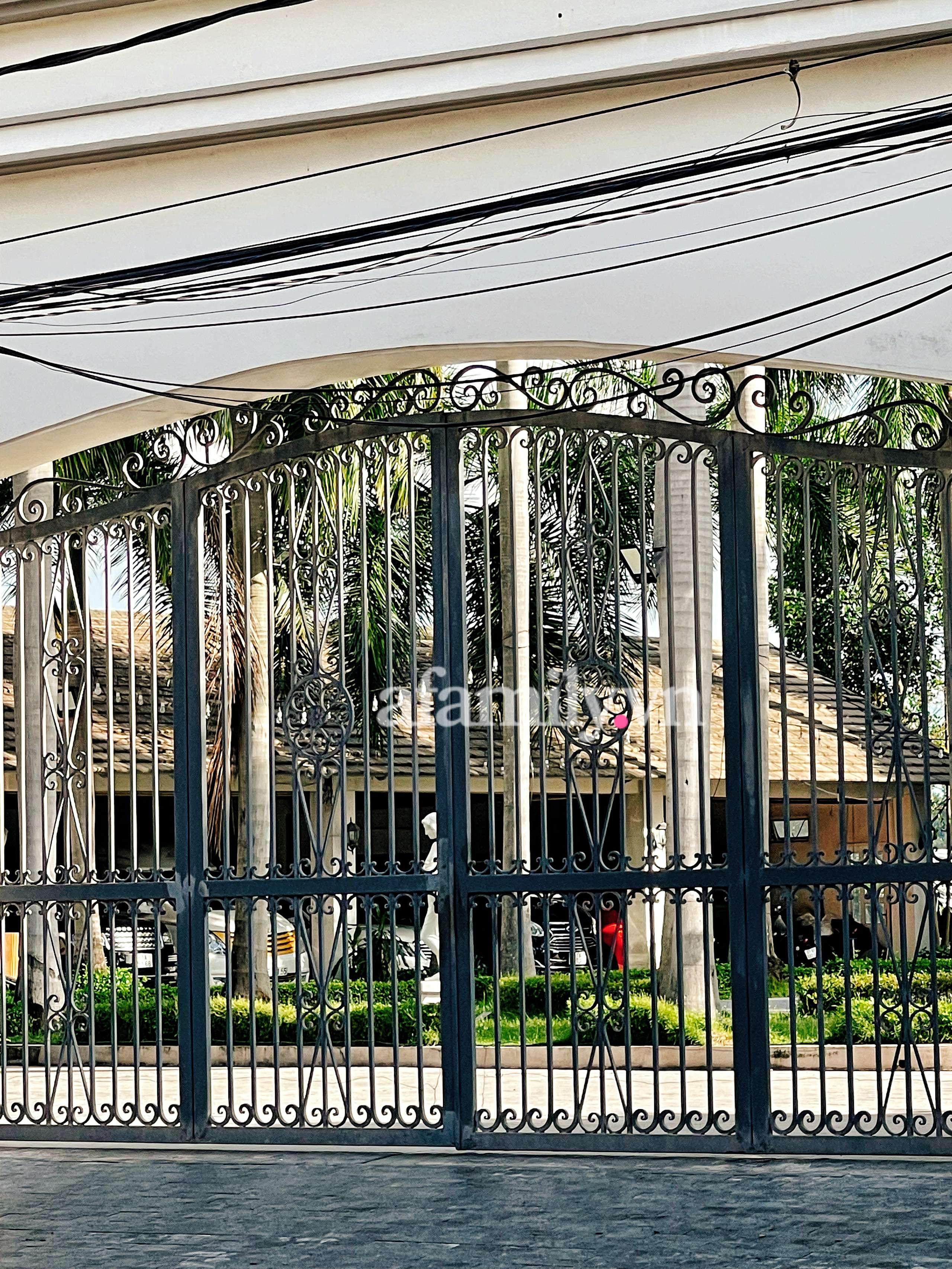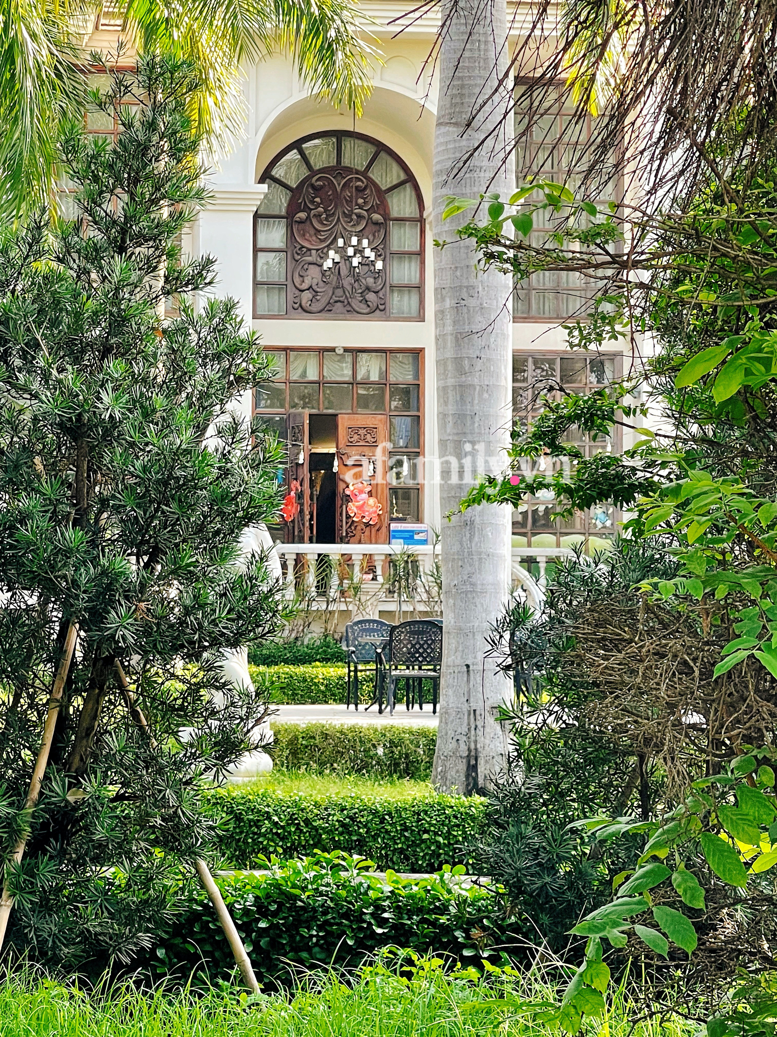 Từ cổng vào cửa chính căn dinh thự này theo ước tính dài khoảng 40 - 50 mét, bao quanh căn dinh thự này là cây cối thoáng đãng cùng nhiều tiểu cảnh hút mắt. Rất khó để nhìn thấy được vào cửa chính bên trong.