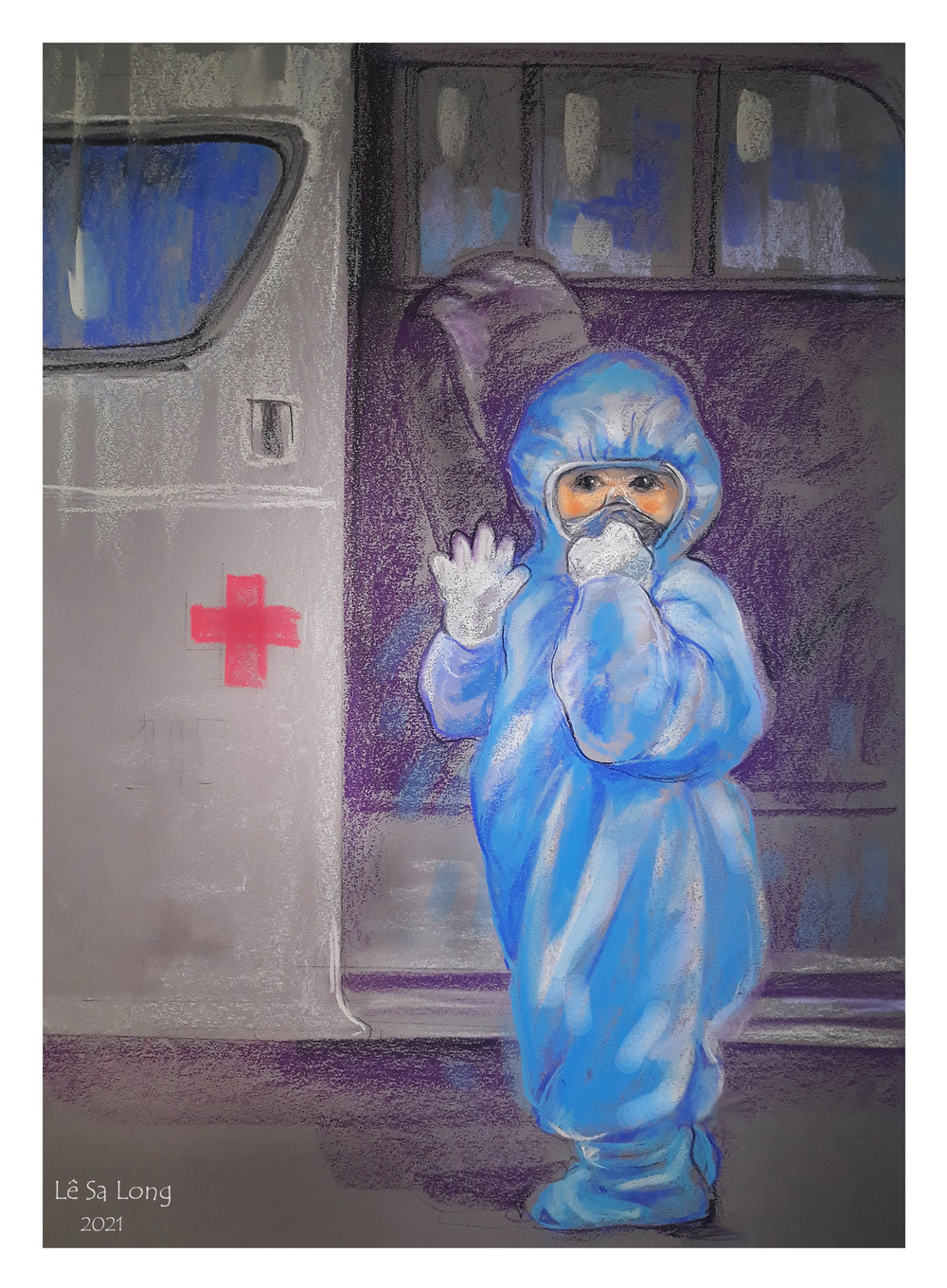 Nhìn hình dáng nhỏ bé trong trang phục phòng hộ cá nhân rộng thùng thình, một mình xa gia đình, leo lên chiếc xe cấp cứu, thương vô cùng.