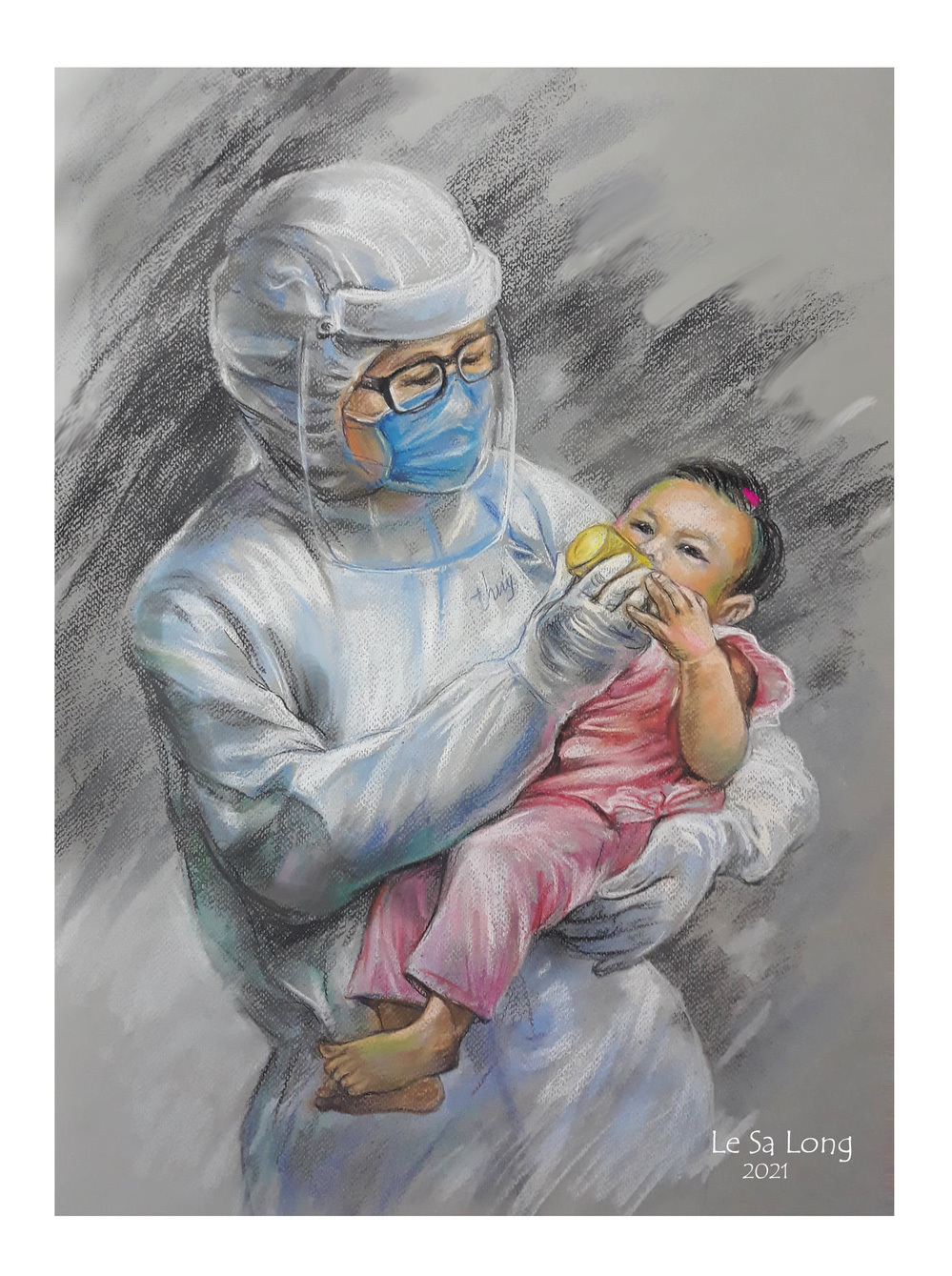Họa sĩ Long vẽ hình ảnh bé lúc xoay người chuẩn bị lên xe. Anh nói vui "cú xoay người thần thánh như hoa hậu Hen dzậy đó, cưng ghê!"