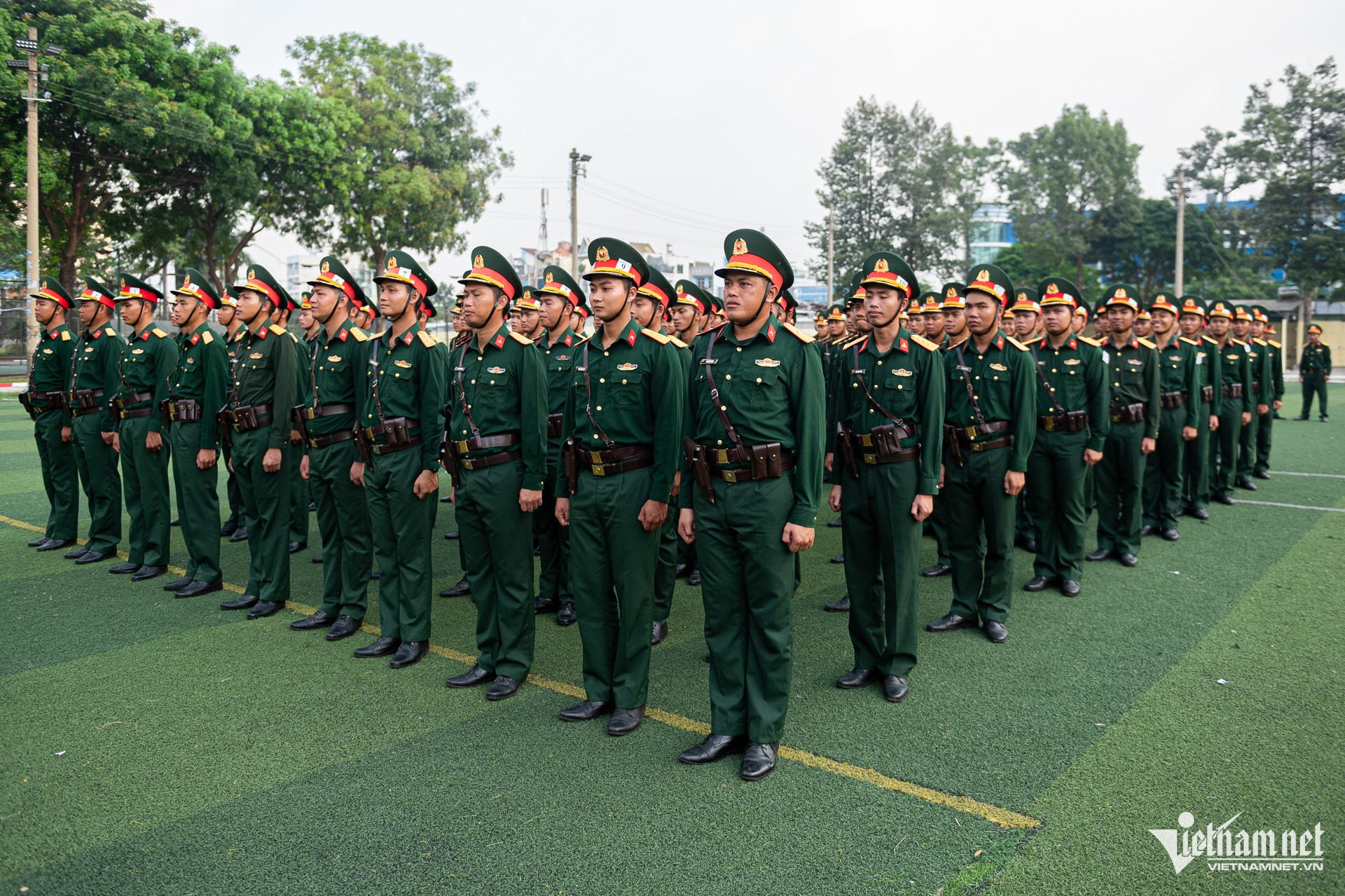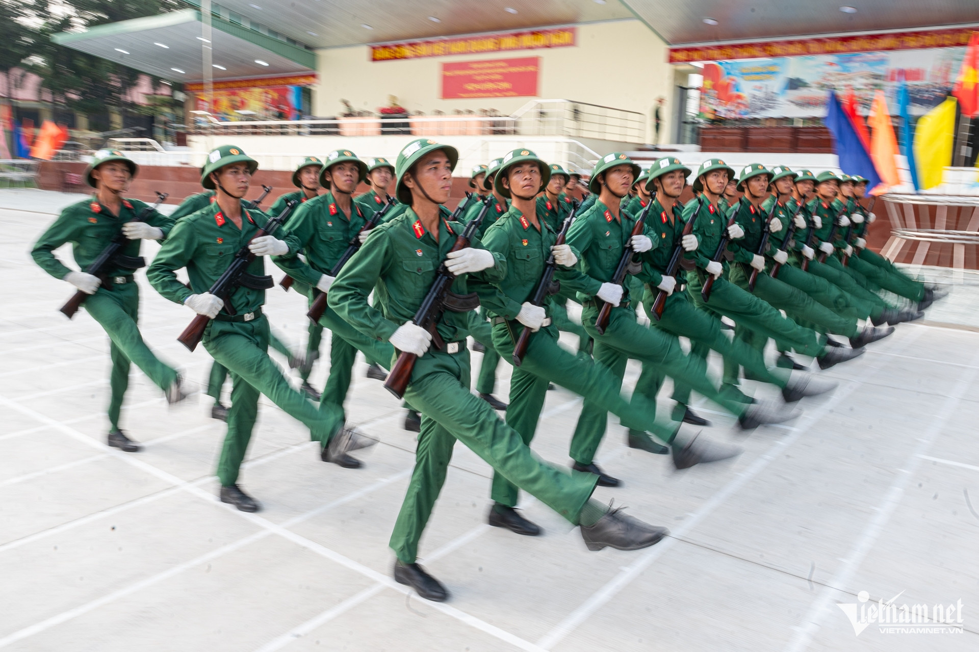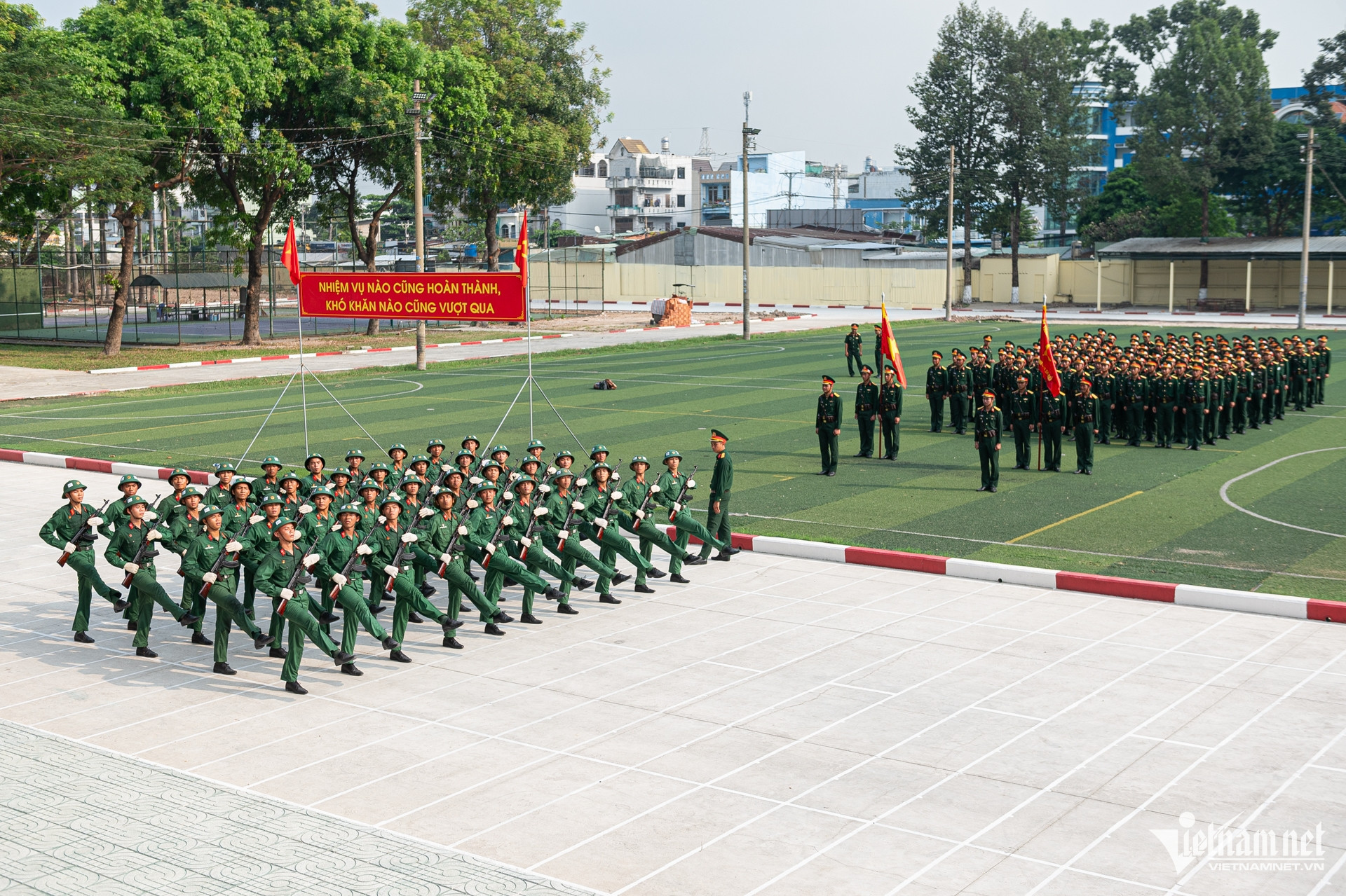 Bất chấp thời tiết nắng nóng, hàng trăm chiến sĩ Trường Quân sự Quân khu 7 (TPHCM) vẫn hăng say luyện tập các động tác sao cho đồng đều, để chuẩn bị diễu binh, diễu hành kỷ niệm 50 năm Ngày thống nhất đất nước.